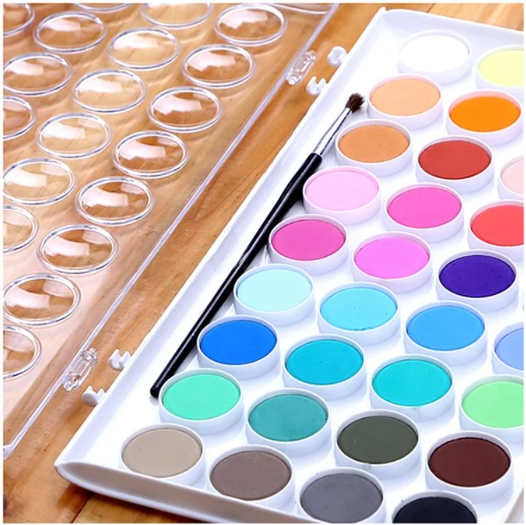 được đựng trong khay nhựa giúp dễ dàng nhận biết màu và pha trộn các màu với nhau. Khay gồm 36 bánh màu với sắc màu cơ bản,