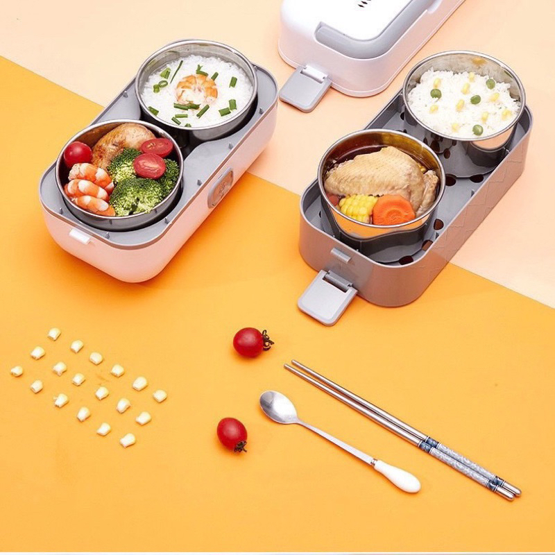 Hộp cơm giữ nhiệt hâm nóng bằng điện qua cổng sạc. Chất liệu vỏ nhựa, ruột inox 304, 3 tầng.