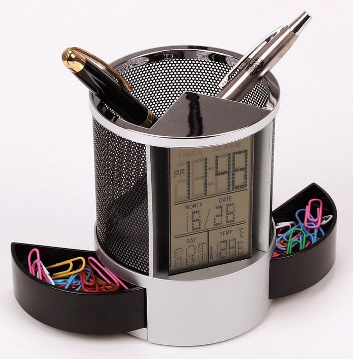 Khay đựng bút; dụng cụ văn phòng có đồng hồ