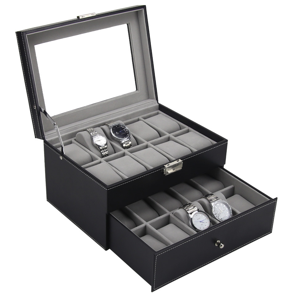 - Hộp thiết kế 2 tầng mỗi tầng đựng 10 cái đồng hồ, tầng trên có khóa, tầng dưới kiểu ngăn kéo