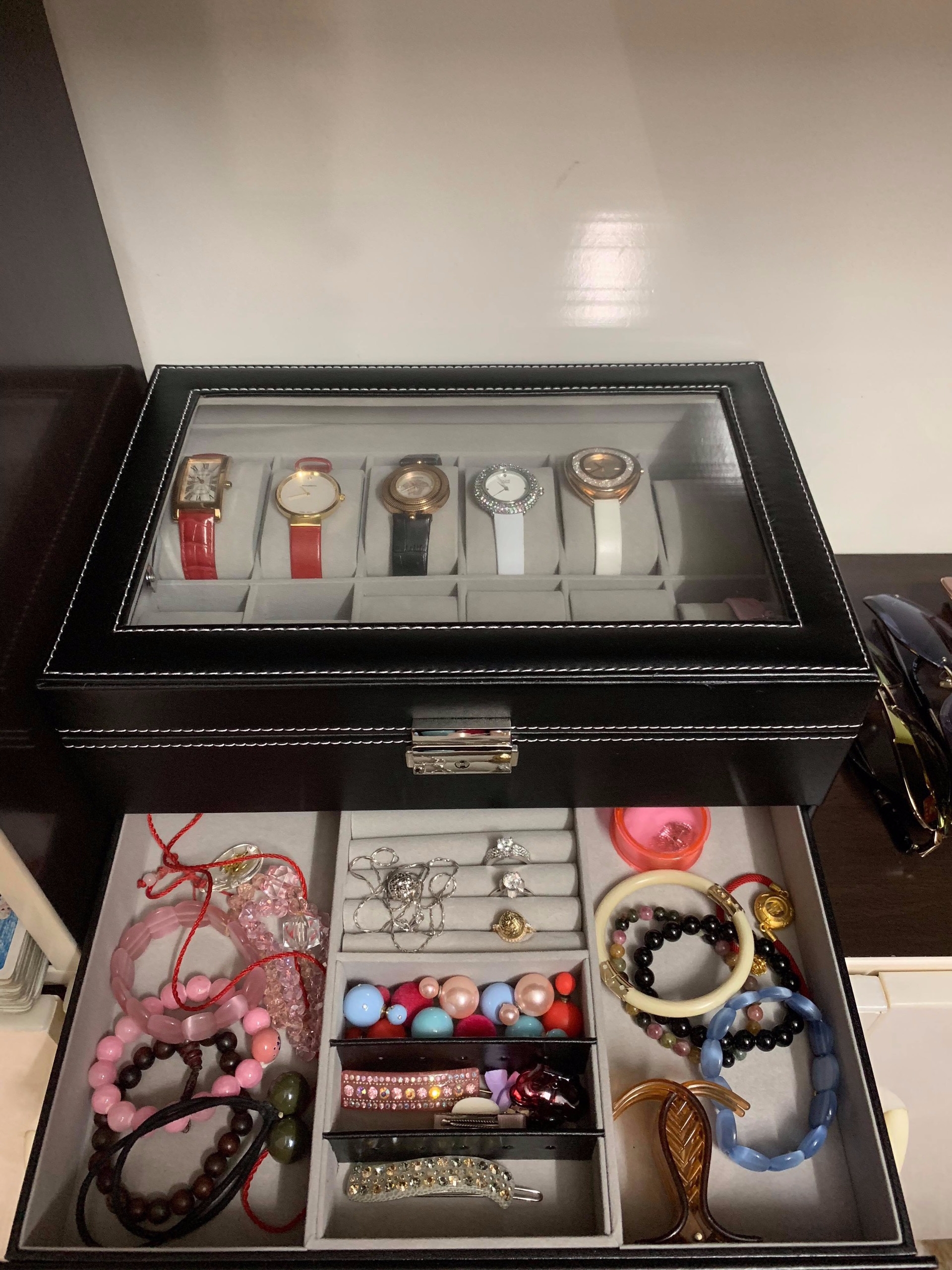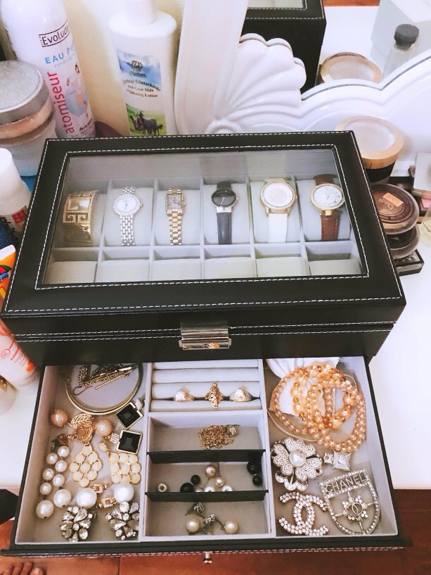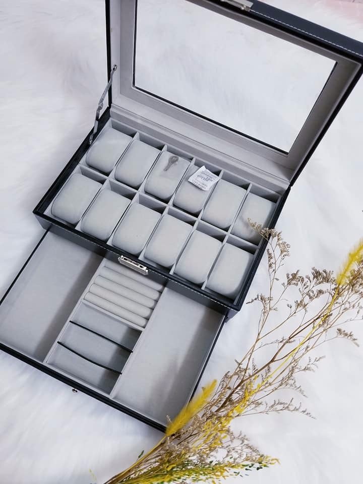 Bạn có khoảng 6-8 chiếc đồng hồ và phụ kiện trang sức như nhẫn, vòng ùng với đó bạn thích hộp có mặt kính để nhìn thấy phụ kiện bên trong hộp và hộp có