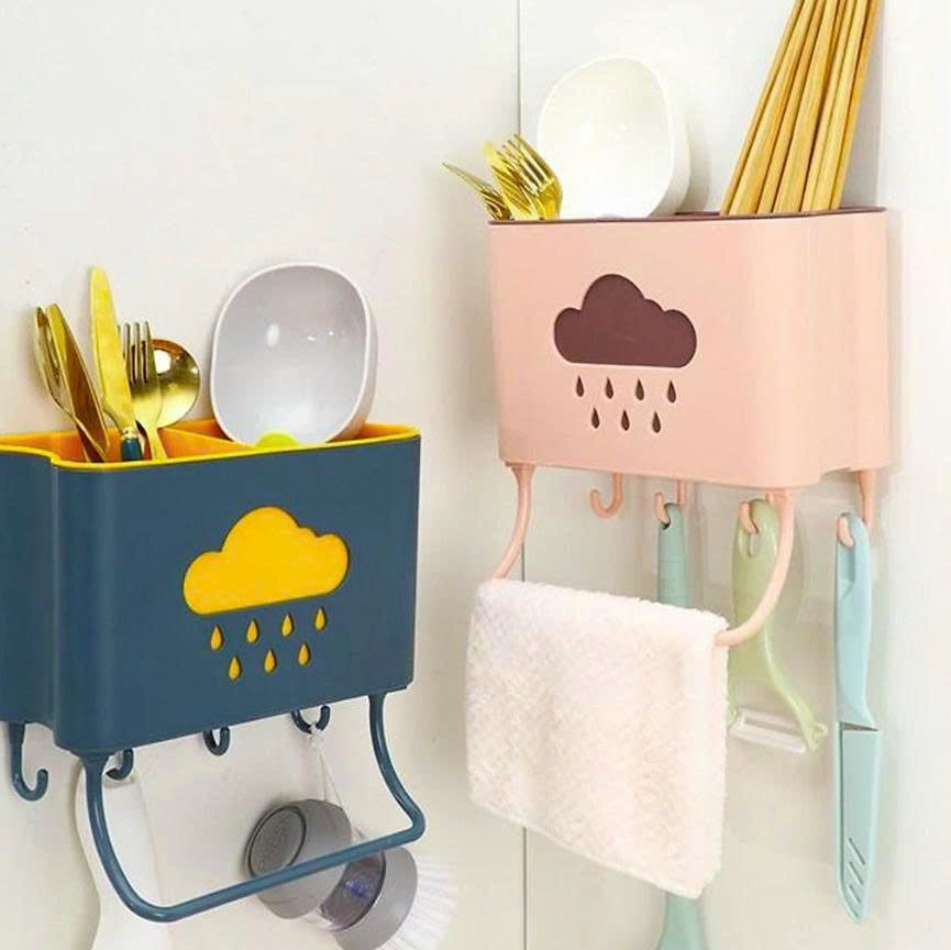 ✨Hộp đựng đũa muỗng treo tường kèm móc treo khăn và dụng cụ bếp, ống đựng đũa muỗng hình đám mây