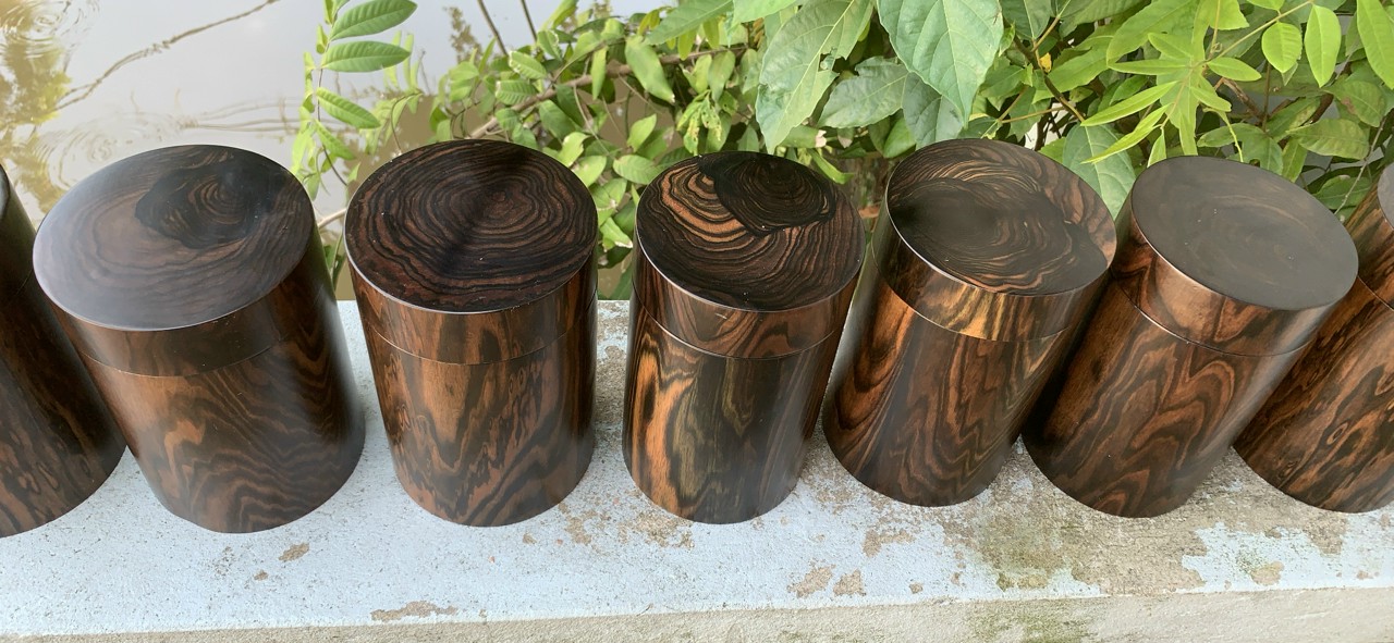 _ Hộp được trà chè được làm bằng chất liệu gỗ mun hoa tự nhiên 100% _ Kt cao 20 thân tròn 11cm _ Hộp đựng trà chè được tiện khắc phân phúc từ đầu