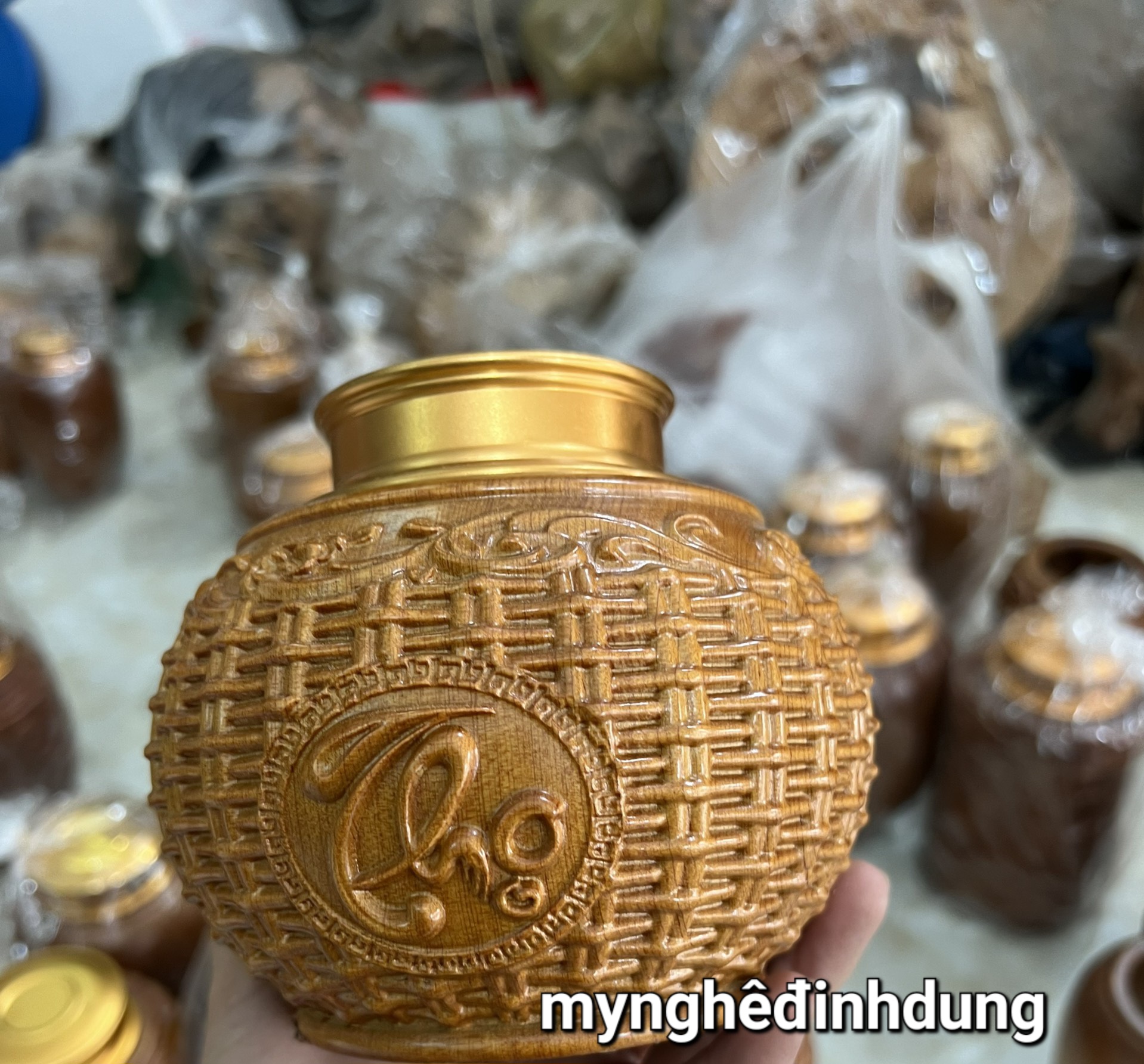_ Hũ chạm khắc chữ phúc lộc thọ kết hợp với hình đan dáng giỏ thời , rất tỉ mỉ tinh xảo kỳ công. Đi hầu hết tất mọi chi tiết góc ngách nội dung hoa văn của Hũ đều được gọt tỉa chỉnh sửa sắc nét hoàn toàn bằng tay thủ công truyền thống.
