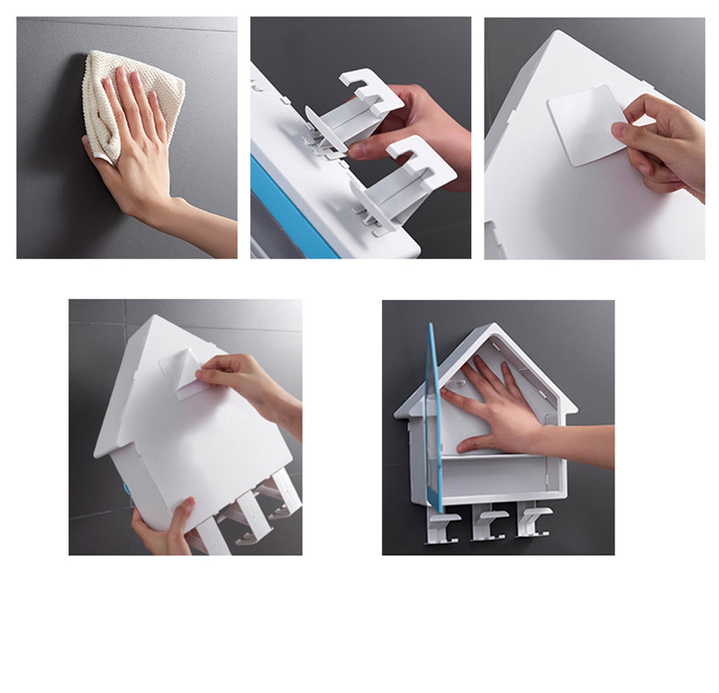 Thiết kế có nắp giúp đựng và chắn bụi. Dính vào tường bằng nắp vít hút chân không chắc chắn, không cần khoan hay đục tường. Phía trên tích hợp một giá gồm các khe