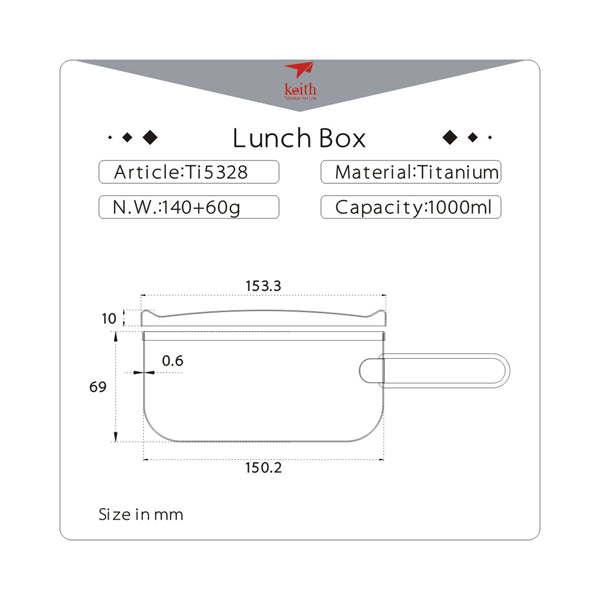 Hộp Lunch Box Titanium Keith Ti5328 1000ml bằng titan nguyên chất có nắp, độ dày khoảng 0,6mm. Được làm bằng titan nguyên chất, an toàn và tốt cho sức khỏe, có khả năng chống axit và kiềm và chống ăn mòn. Không giữ lại bất kỳ hương vị nào sau thời gian dài sử dụng, đảm bảo sức khỏe cho mỗi bữa ăn. Lunch box phù hợp cho cuộc sống hàng ngày, bao gồm bữa sáng, bữa trưa và bữa tối, cũng như cho bữa trưa, cắm trại và các hoạt động ngoài trời của sinh viên và nhân viên văn phòng. Nó có thể được làm nóng trực tiếp bằng trên lửa, bếp từ và bếp điện để đun sôi nước và nấu ăn. Và cũng có thể được sử dụng để bảo quản thực phẩm.