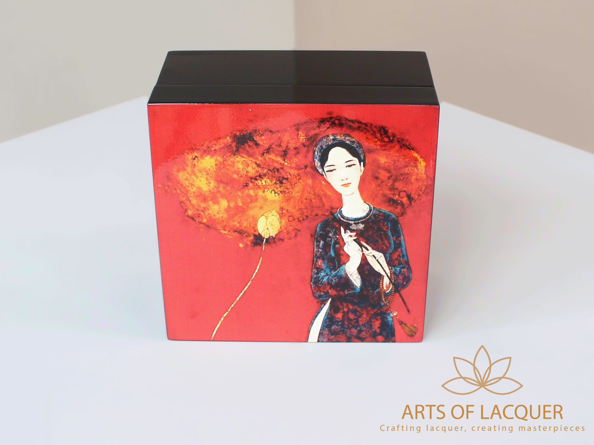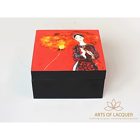 Hộp Vuông Sơn Mài Họa Tiết Cô Gái Cầm Hoa Sen