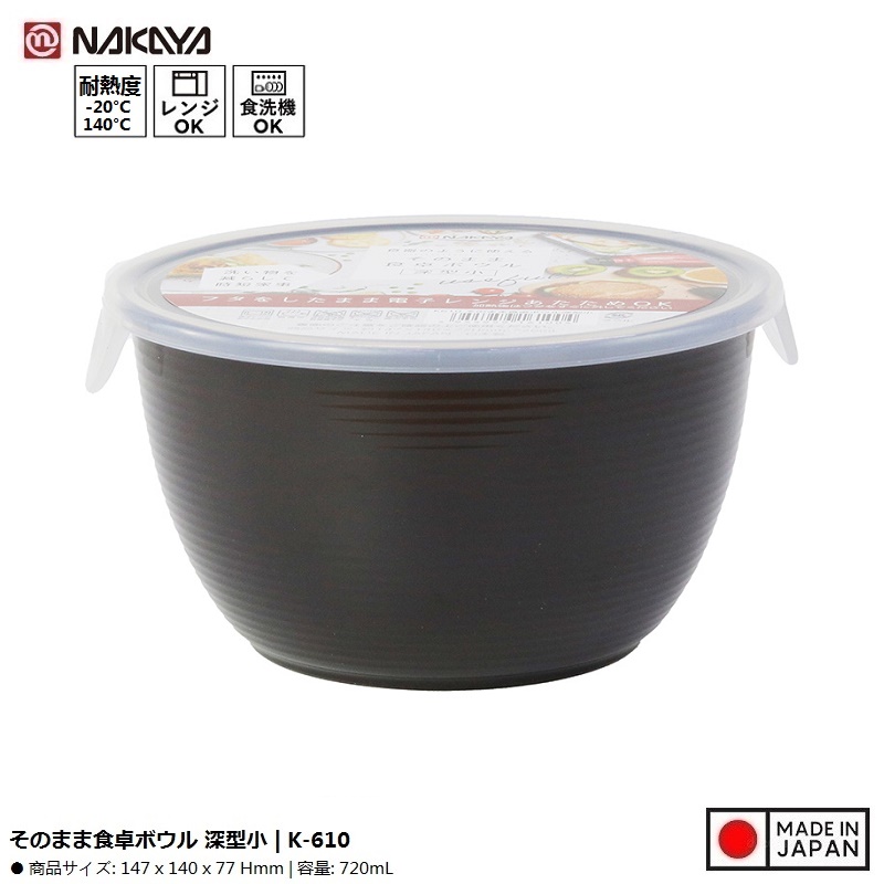 Hộp nhựa dùng trong lò vi sóng Nakaya 720ml ■ Xuất xứ: Nhật Bản | MADE IN JAPAN ■ NSX: Nakaya Chemical Industry Co., Ltd (Japan) ■ Model: K-610 ■ Dung tích: 720ml ■ Kích thước: Ø147x140x77H㎜ ■ Màu