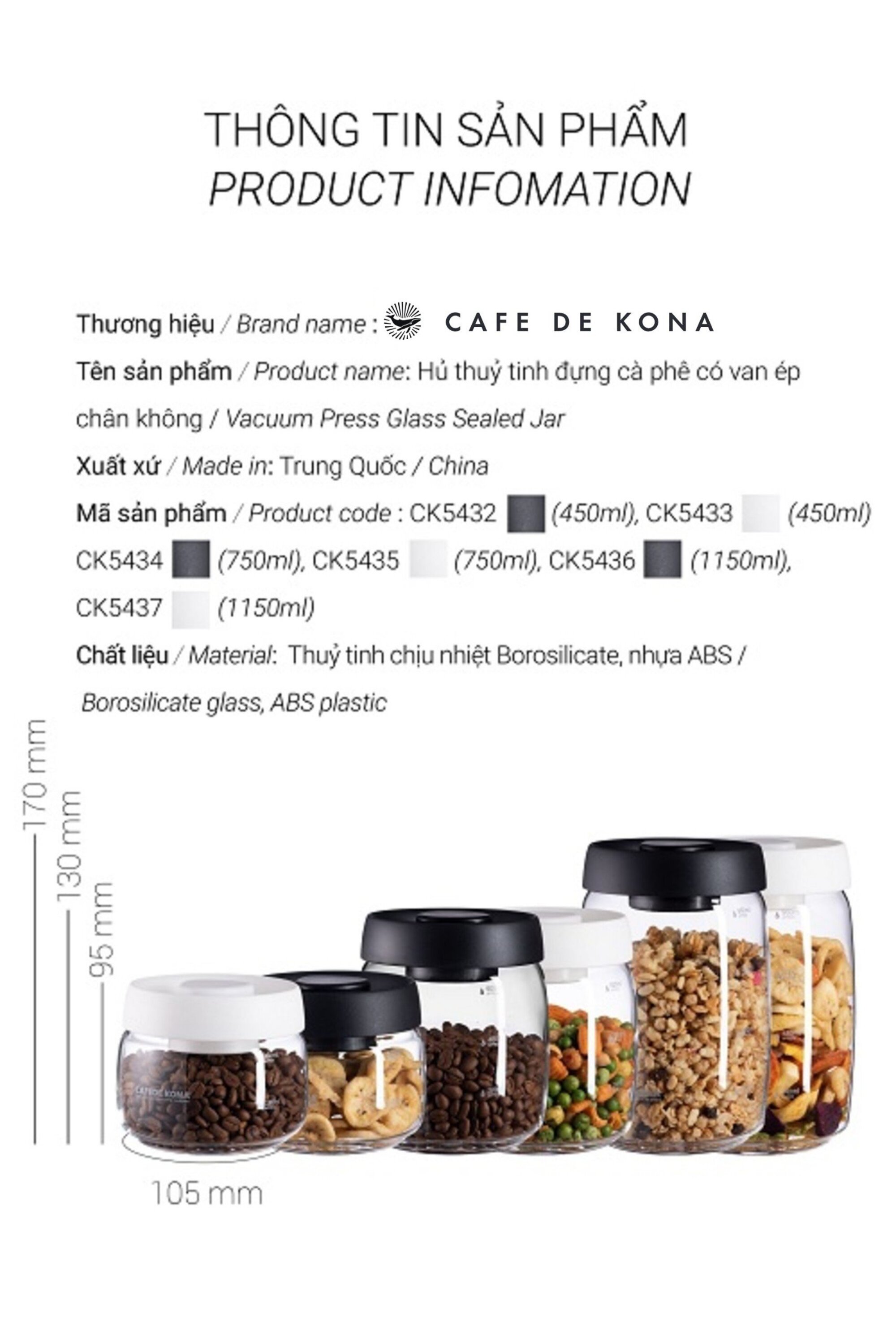 HŨ THỦY TINH HÚT CHÂN KHÔNG CAO CẤP CAFE DE KONA Giữ thực phẩm chuẩn vị hương thơm vốn có Được làm từ thủy tinh Borosilicate cao cấp cùng bề mặt nhẵn mịn