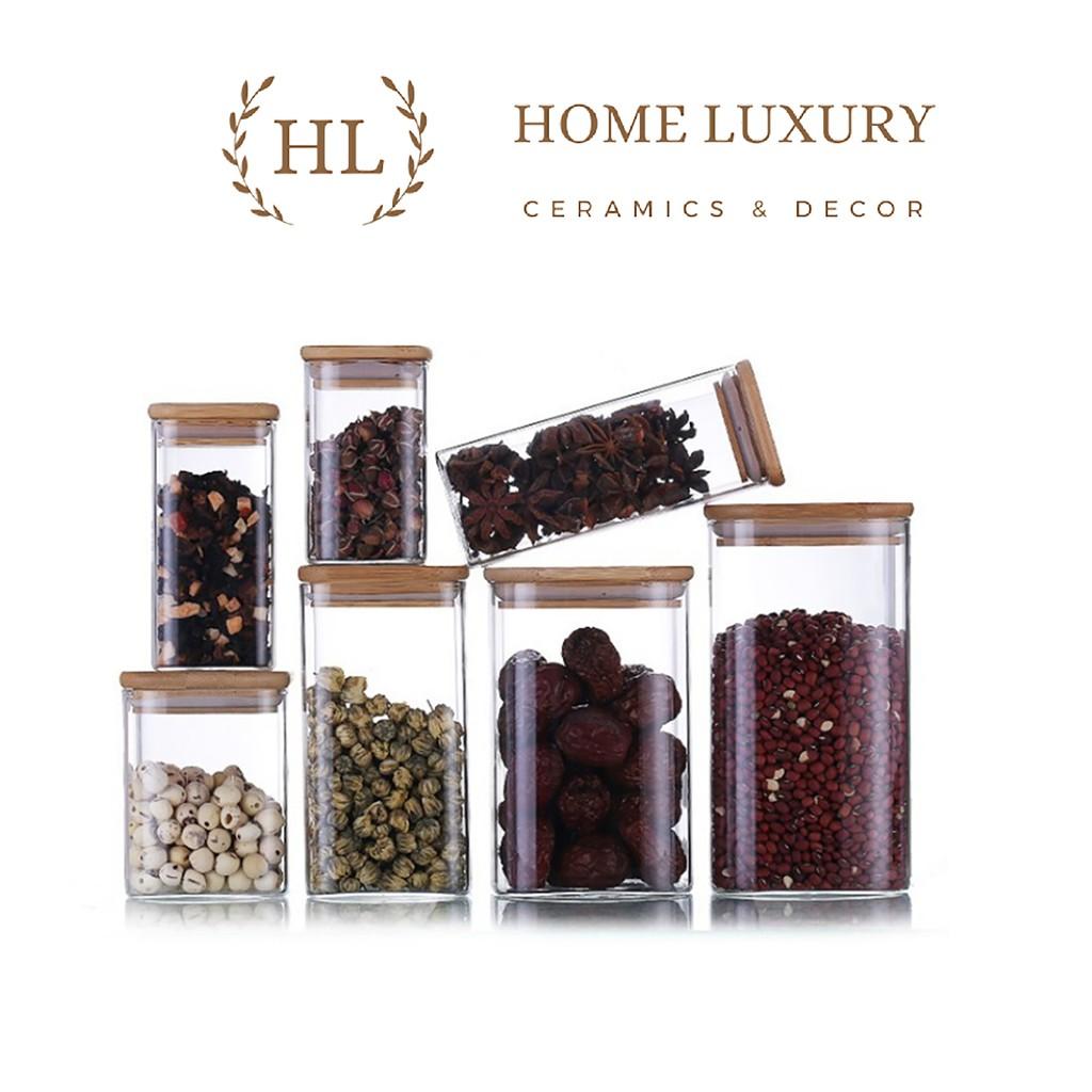 Hũ thuỷ tinh nắp gỗ dáng vuông độc đáo để đựng các loại hạt, đồ khô hay bánh kẹo, mì khô vừa đẹp, lại sạch sẽ, gọn gàng Hũ có nắp gỗ có gioăng silicone