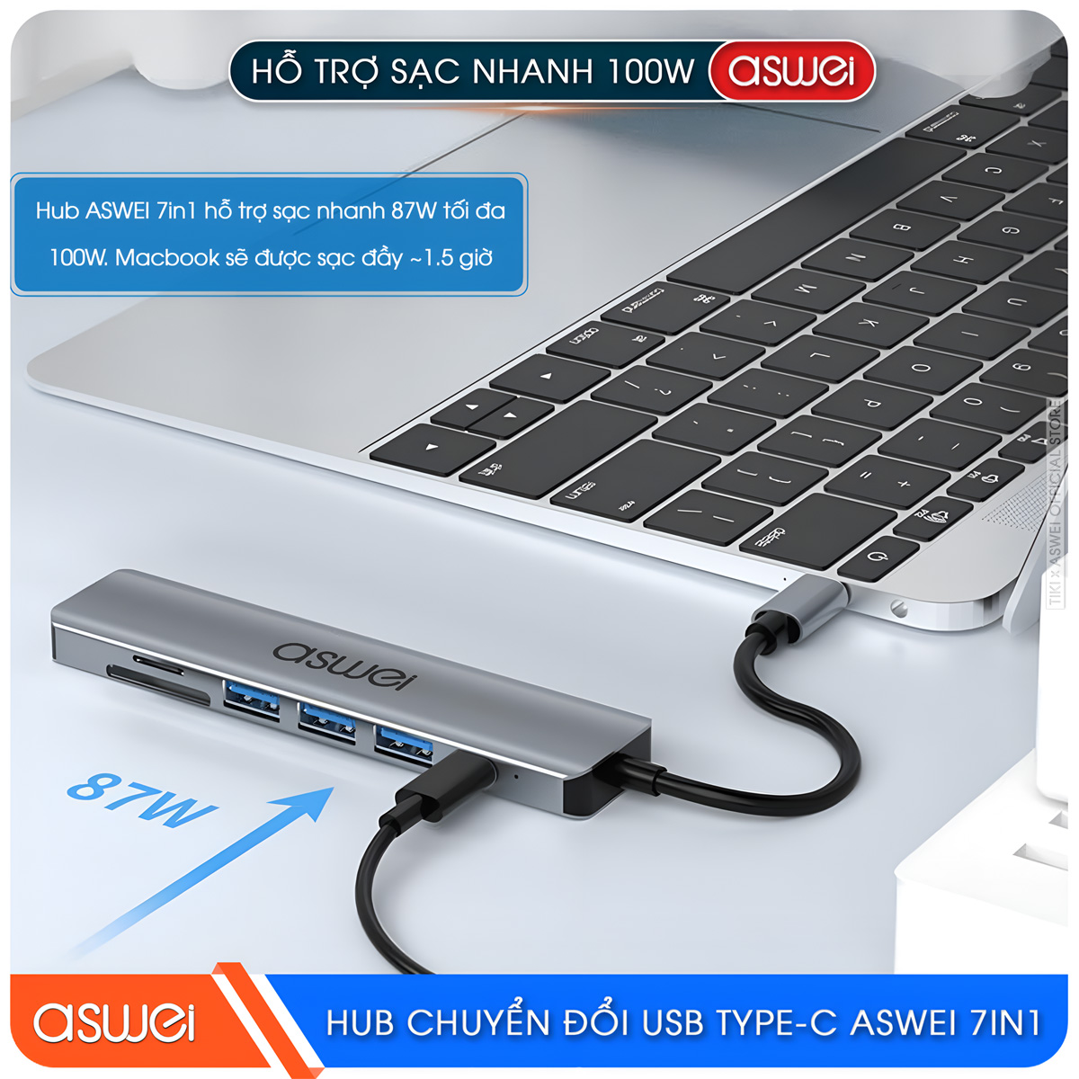 ✨Hub Chuyển Đổi USB Type C ASWEI 7 in 1 - HDMI, USB 3.0, SD, TF, USB C, PD 100W Tốc Độ Cao - Hàng Chính Hãng