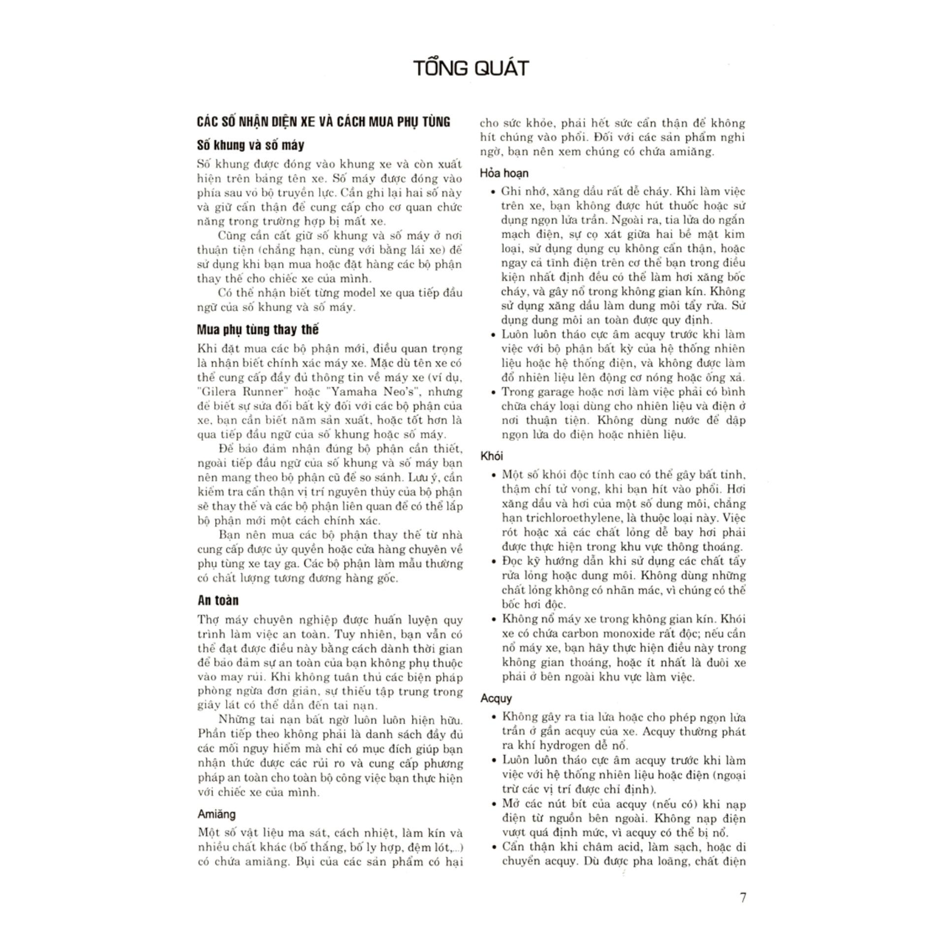 Cuốn sách này trình bày các hệ thống trên xe tay ga theo từng chương riêng biệt, với đầy đủ quy trình tháo lắp, kiểm tra, và thay các bộ phận của hệ thống. Mỗi quy trình được viết theo cách hướng dẫn từng bước để bạn có thể tự thực hiện và tận hưởng cảm giác thỏa mãn sau khi hoàn thành công việc. Ngoài ra, với những công việc đơn giản, tự thực hiện còn giúp bạn tiết kiệm thời gian.