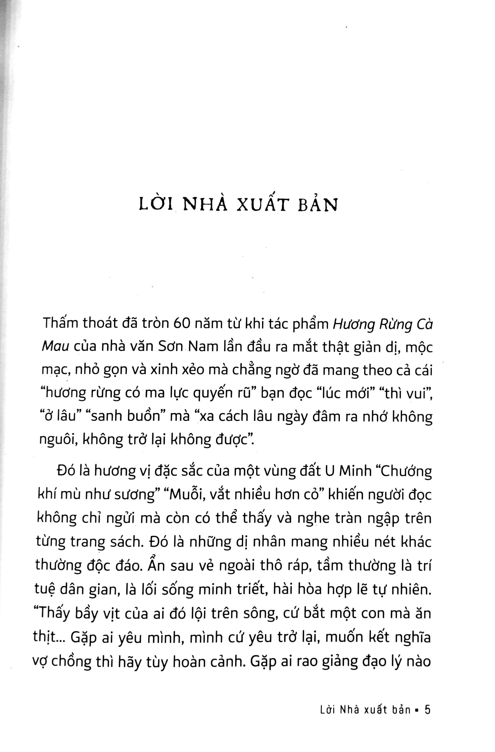 Nhà xuất bản gửi đến bạn đọc 18 truyện ngắn của tác phẩm Hương Rừng Cà Mau gần như nguyên vẹn câu chữ theo bản in đầu tiên tại nhà xuất-bản Phù-Sa vào năm 1962 như một lời tri ân với ông già Nam Bộ đã hóa thành hạt bụi hòa trong lòng đất đai quê xứ.
