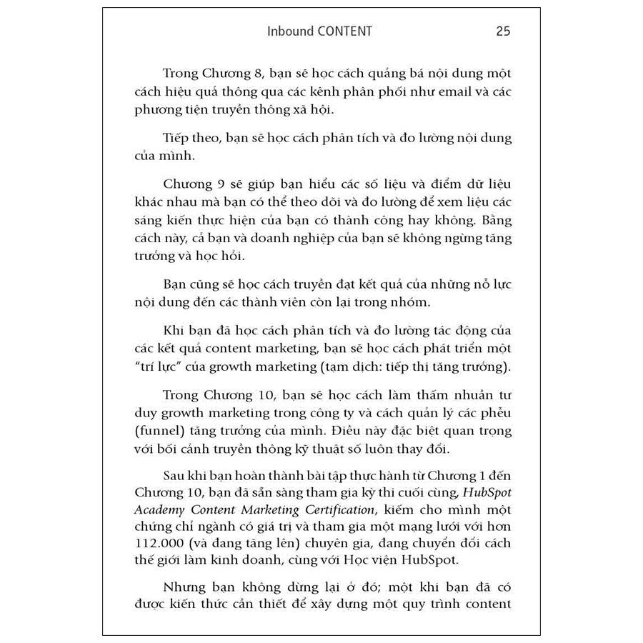 Nói như Bill Gates: “Content is King” (Nội dung là vua), ngày nay nội dung đang dần thống trị tất cả các chiến lược Digital Marketing, trở thành một yếu tố quan trọng giúp thương hiệu đạt được hiệu quả kinh doanh. Có một trang web và phương tiện truyền thông xã hội là không đủ. Nếu bạn thực sự muốn tận dụng mức độ kết nối chưa từng có, bạn phải tạo ra nội dung thu hút khách hàng. Đó không phải là việc mở rộng một cách mù quáng mà là việc nội dung cần tiếp cận đúng đối tượng. Ngày nay, việc tạo ra khách hàng không chỉ phụ thuộc vào đội ngũ bán hàng, bằng cách tạo nội dung với hướng tiếp cận đúng, khách hàng sẽ đến với bạn. Đi sâu vào việc sáng tạo và tổ chức sáng tạo nội dung, trong cuốn sách Inbound Content bạn sẽ học được:
