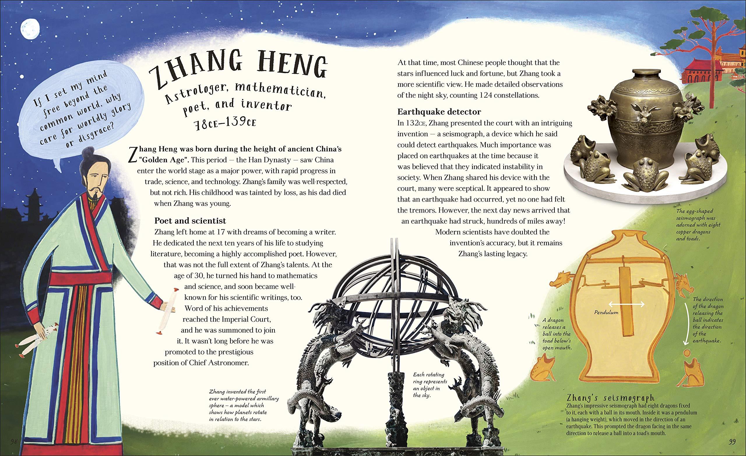 Step into Leonardo da Vinci's workshop, relax on board Hideo Shima's speedy bullet train, and join movie star Hedy Lamarr to bounce ideas around in between takes. Inventors looks at the towering achievements of more than 50 inventors in great detail. The stories are as unusual as they are unique. From Mr. Kellogg, who accidentally created cornflakes after leaving grains boiling for too long, to the ancient Turkish polymath Ismail al-Jazari, who decided the best way to power a clock was with a model elephant, to Sarah E. Goode's fold-up bed space-saving solution--the inventors of this book have all used tons of creativity to find ways to improve our world. These groundbreaking inventions include the very earliest discoveries to modern-day breakthroughs in science, food, transportation, technology, toys, and more.
