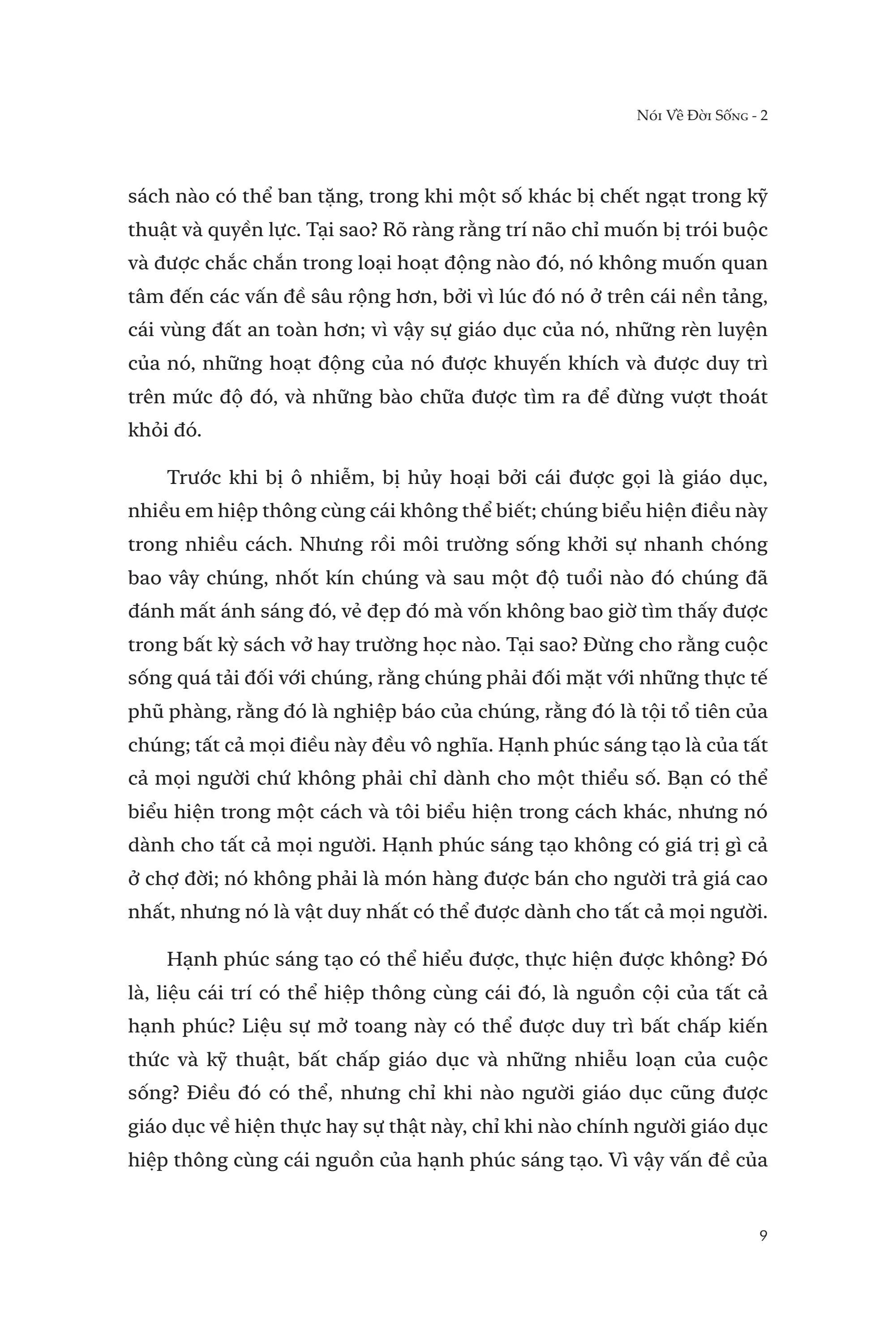 Sống hồn nhiên thật đơn giản biết bao! Nếu không có hồn nhiên thì không thể sống hạnh phúc. Niềm vui của cảm giác không phải là hạnh phúc của hồn nhiên. Hồn nhiên là thoát khỏi gánh nặng ngàn năm của kinh nghiệm. Chính ký ức của kinh nghiệm mới làm hư hoại, chứ không phải tự thân động thái kinh nghiệm. Kiến thức, tức gánh nặng của quá khứ, đã làm hư hỏng, bại hoại. Chính khả năng để tích lũy, sự cố gắng để trở thành đã hủy hoại hồn nhiên; và nếu không có hồn nhiên thì làm sao có thể có trí tuệ. Người mà chỉ hiếu kỳ, tò mò, tìm hiểu thôi thì không bao giờ có thể biết được trí tuệ; họ sẽ tìm thấy nhưng điều họ tìm được không phải là sự thật. Người hoài nghi không bao giờ có thể biết được hạnh phúc, bởi vì hoài nghi là lo âu về chính cuộc sống của m.ình, và sợ hãi tạo ra hủy hoại. Không sợ hãi không phải là can đảm mà là tự do khỏi sự tích lũy.