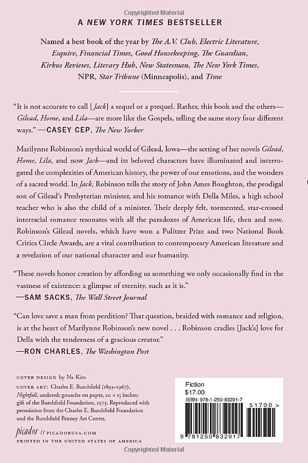 Jack is Robinson’s fourth novel in this now-classic series. In it, Robinson tells the story of John Ames Boughton, the prodigal son of Gilead’s Presbyterian minister, and his romance with Della Miles, a high school teacher who is also the child of a preacher. Their deeply felt, tormented, star-crossed interracial romance resonates with all the paradoxes of American life, then and now.