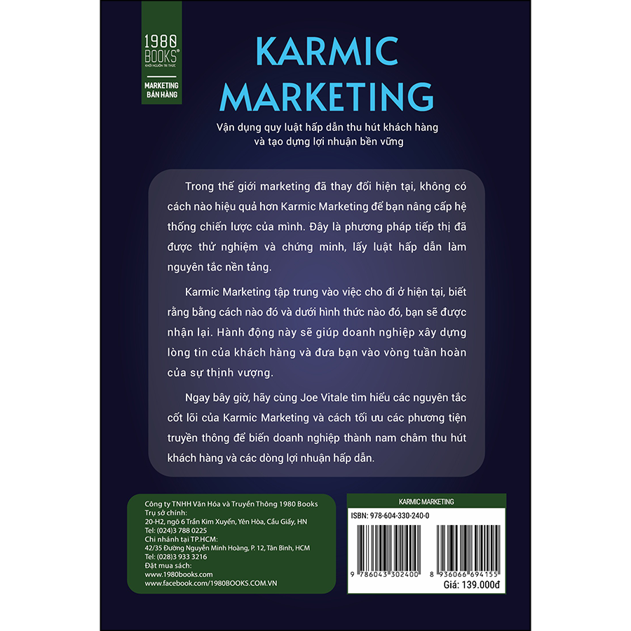 Bạn phải nâng cấp trò chơi của mình. Thế giới không ngừng phát triển, và với tư cách là một nhà tiếp thị hoạt động trong thế giới mới này, bạn phải phát triển cùng với nó. Chúng ta đã bước vào kỷ nguyên mà niềm tin quyết định liệu các nỗ lực marketing của bạn có thành công hay không. Theo Joe Vitale, không có cách nào hiệu quả hơn Karmic Marketing, phương pháp tiếp thị đã được thử nghiệm và chứng minh, lấy luật hấp dẫn làm nguyên tắc nền tảng.