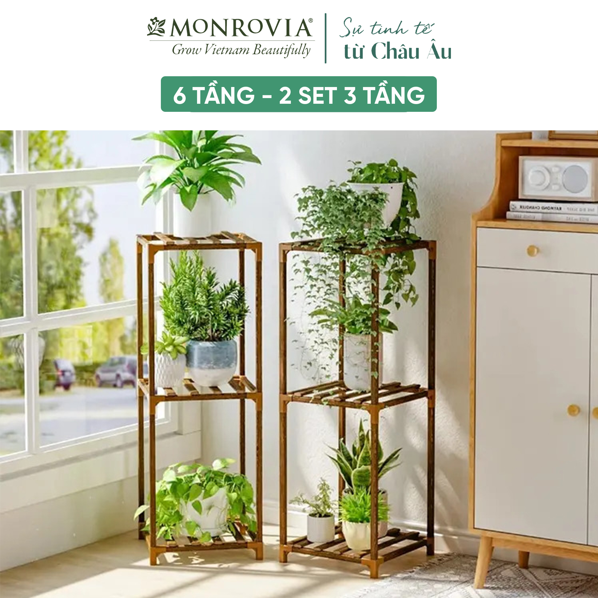 Kệ gỗ decor MONROVIA để cây trang trí trong nhà, ban công, từ 6 đến 15 tầng, tiêu chuẩn Châu Âu