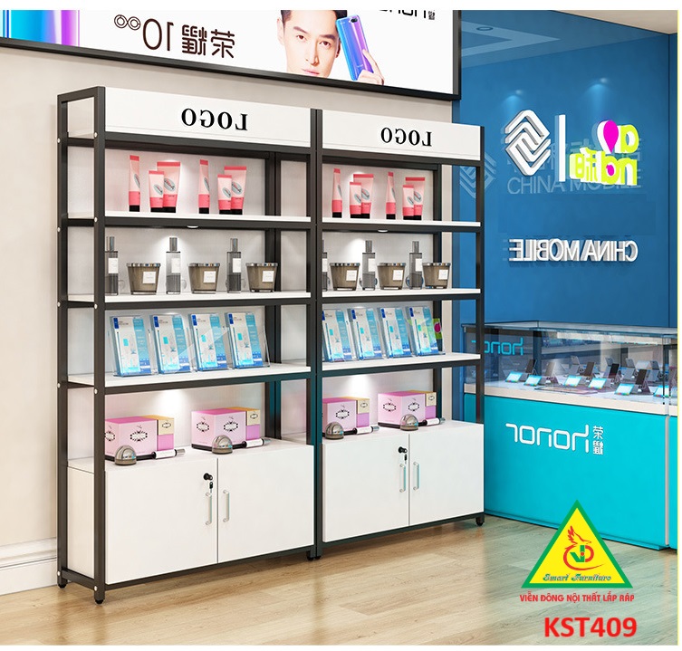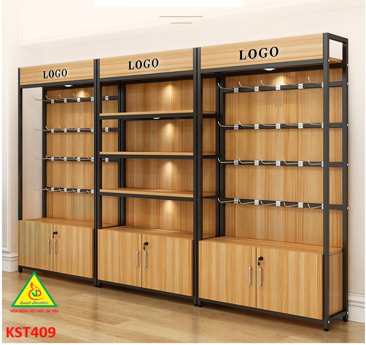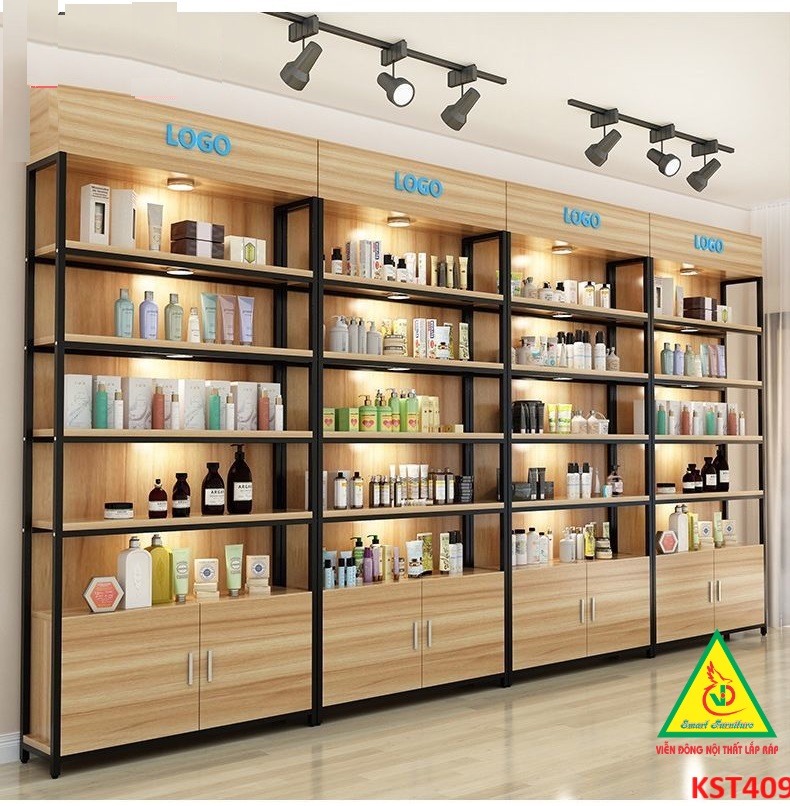 • Kệ gỗ khung sắt có tủ kết hợp hệ thống đèn led làm nỗi bật sản phẩm trưng bày trên kệ.