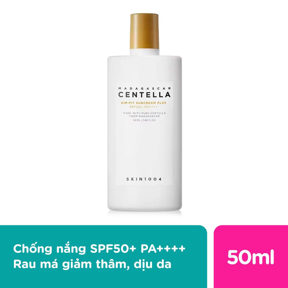 Mua tại TiktokKem Chống Nắng Skin1004 Madagascar Centella Air-Fit SunCream Plus SPF50+ PA++++ 50ml Kem Chống Nắng Skin1004 Madagascar Centella Air-Fit SunCream Plus SPF50+ PA++++ 50ml là kem chống nắng vật lý với thành phần từ rau má an toàn cho mọi loại da, bất kể da mụn hay nhạy cảm. Chống nắng tối đa với chỉ số chống nắng cao: SPF 50+/PA++++. Không để lại vệt trắng (white cast) và không gây bết dính, nhờn rít, mang lại cảm giác siêu dễ chịu. Thành phần chính và công dụng: - Chiết xuất rau má vùng Madagascar giàu vitamin B,C và polyphenol có khả năng chống oxi hóa, phục hồi, làm dịu da, giảm thâm, giúp da trắng sáng mịn màng, hỗ trợ loại bỏ mụn.