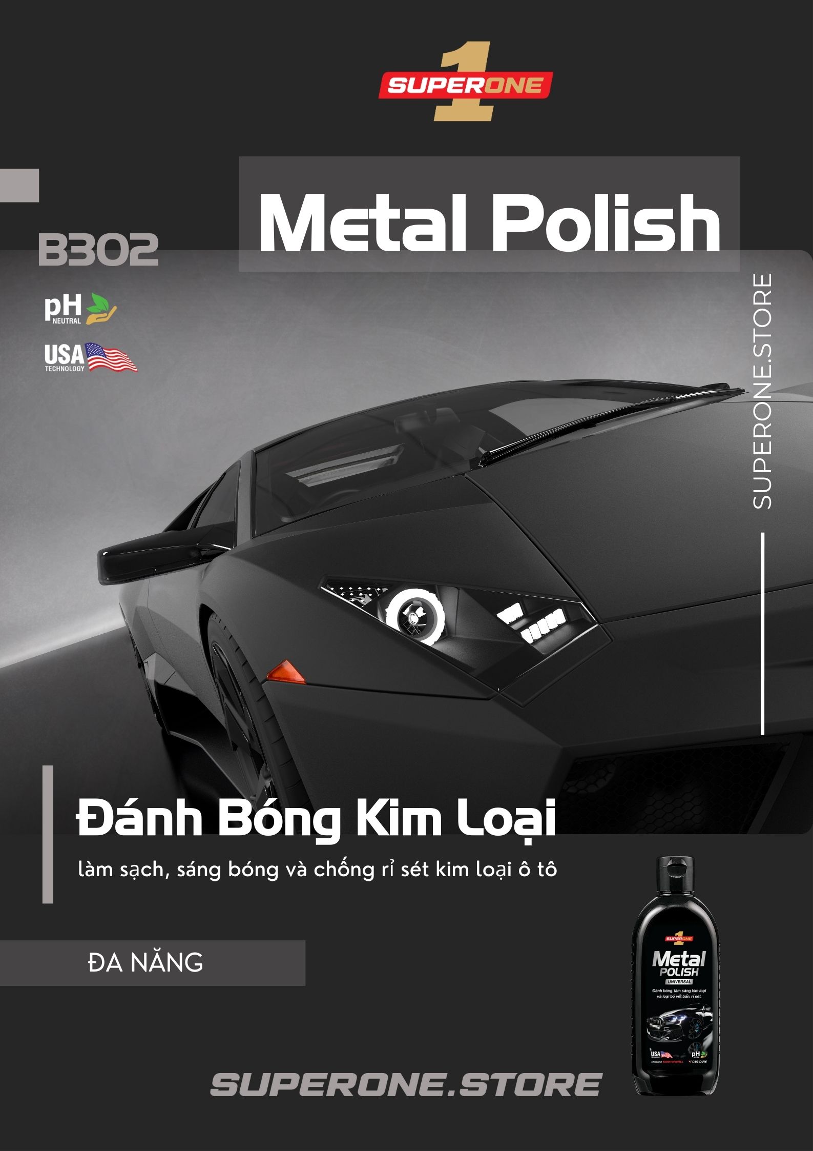 LÀM SẠCH, SÁNG BÓNG, CHỐNG RỈ SÉT KIM LOẠI Kem   Đánh Bóng Kim Loại Super One Metal Polish là một sản phẩm không thể thiếu   trong việc chăm sóc ô tô của bạn. Với khả năng làm sáng bóng các bề mặt kim   loại như lưới tản nhiệt, mâm vành, ốp trang trí, sản phẩm này nhanh chóng và   dễ dàng loại bỏ hiện tượng oxy hóa, vết rỉ sét, trầy xước nhỏ và các vết ố   khó chịu khác. Đặc biệt, sản phẩm không chứa axit an toàn cho tất cả các loại   bề mặt kim loại, bao gồm chrome, nhôm, đồng và thép không rỉ. Sản phẩm này   không chỉ làm sạch và đánh bóng mà còn đảm bảo không gây trầy xước, để lại lớp   bóng như gương. Công thức đặc biệt chứa các chất ức chế ăn mòn giúp ngăn ngừa   sự hình thành lại rỉ sét. Sử dụng dễ dàng và hiệu quả, giúp duy trì sự rạng   ngời của ô tô bạn trong thời gian dài.   Đặc Tính Sản Phẩm