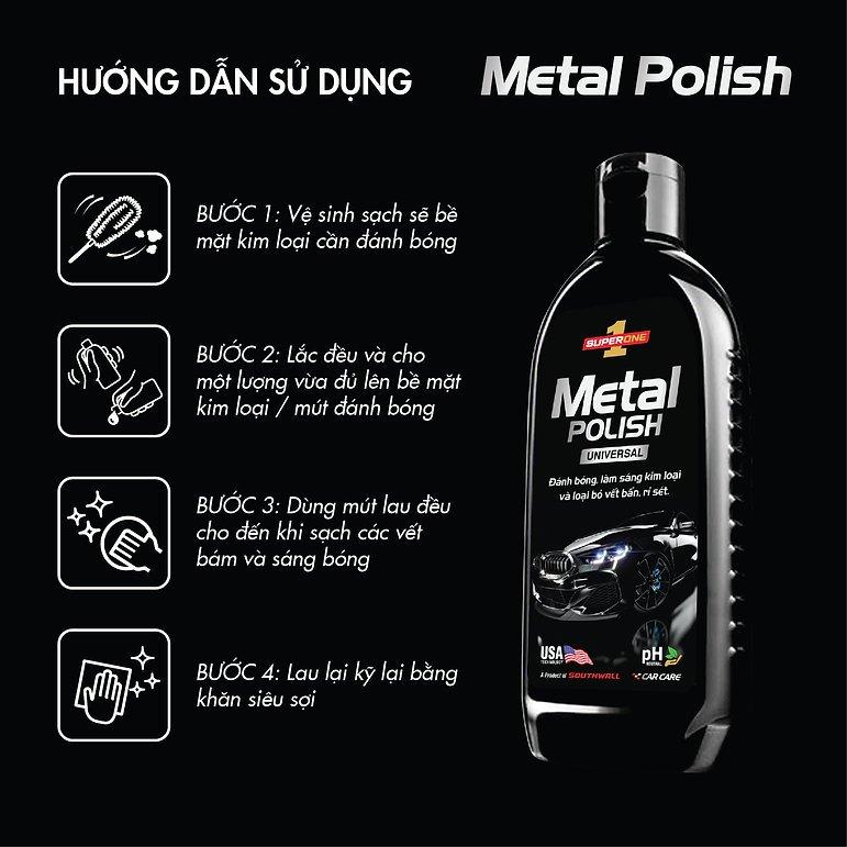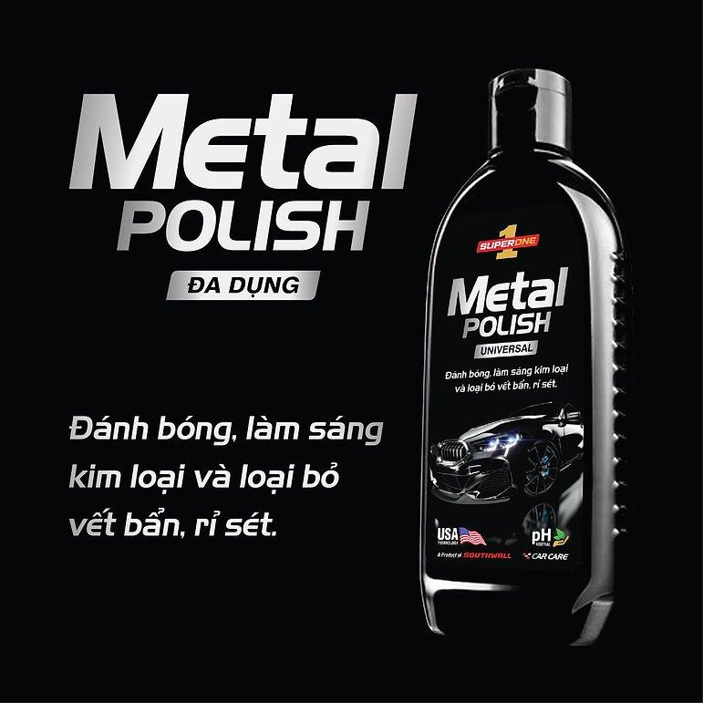 LÀM SẠCH, SÁNG BÓNG, CHỐNG RỈ SÉT KIM LOẠI Kem   Đánh Bóng Kim Loại Super One Metal Polish là một sản phẩm không thể thiếu   trong việc chăm sóc ô tô của bạn. Với khả năng làm sáng bóng các bề mặt kim   loại như lưới tản nhiệt, mâm vành, ốp trang trí, sản phẩm này nhanh chóng và   dễ dàng loại bỏ hiện tượng oxy hóa, vết rỉ sét, trầy xước nhỏ và các vết ố   khó chịu khác. Đặc biệt, sản phẩm không chứa axit an toàn cho tất cả các loại   bề mặt kim loại, bao gồm chrome, nhôm, đồng và thép không rỉ. Sản phẩm này   không chỉ làm sạch và đánh bóng mà còn đảm bảo không gây trầy xước, để lại lớp   bóng như gương. Công thức đặc biệt chứa các chất ức chế ăn mòn giúp ngăn ngừa   sự hình thành lại rỉ sét. Sử dụng dễ dàng và hiệu quả, giúp duy trì sự rạng   ngời của ô tô bạn trong thời gian dài.   Đặc Tính Sản Phẩm
