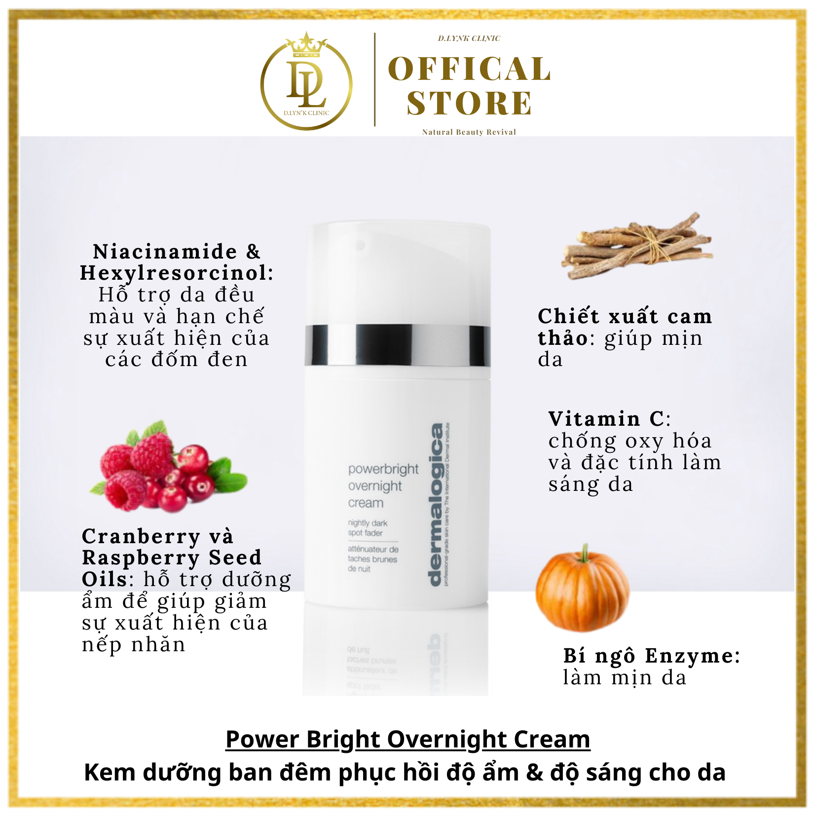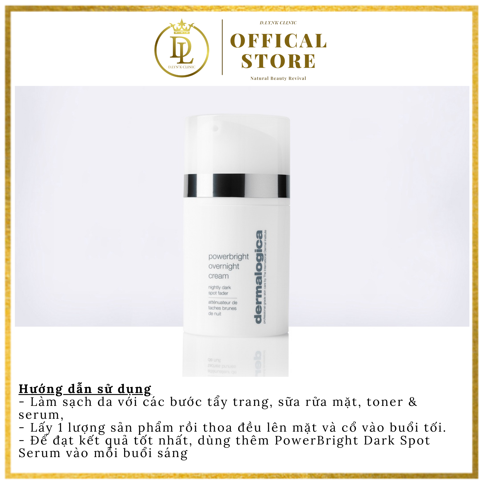 - Làm mịn và làm mềm kết cấu da CÁCH SỬ DỤNG Thoa đều khắp mặt và cổ mỗi tối. Để có kết quả tốt nhất, hãy sử dụng cùng với PowerBright Dark Spot Serum vào mỗi buổi sáng. THÀNH PHẦN NỔI BẬT