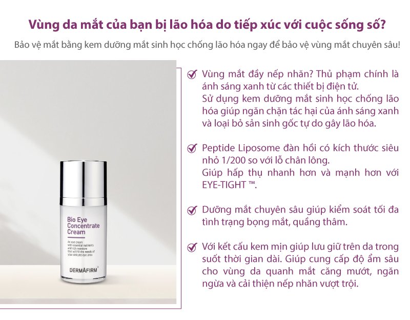 Kem xóa nhăn và giảm thâm vùng mắt Bio Eye Concentrate Cream ĐIỂM NỔI BẬT Bio Eye Concentrate Cream là sản phẩm chăm sóc, chống nhăn, sử dụng công nghệ peptide liposome đàn hồi, được