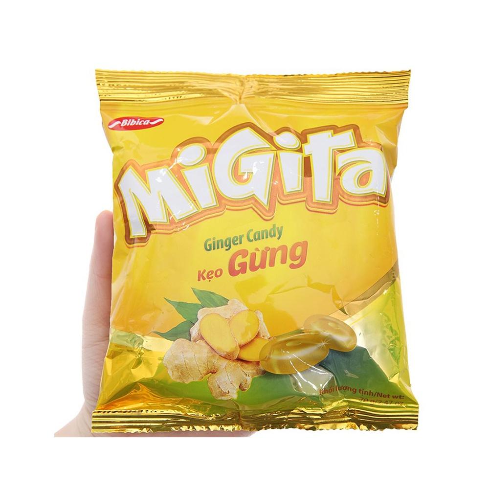 Kẹo cứng Migita gừng túi 400 gam - Bibica Loại kẹo: Kẹo gừng Khối lượng: 400g Số lượng: 143 viên/túi (2.8g/viên)/ 20 túi/ thùng Sản xuất: Việt Nam Ưu điểm: Kết hợp hoàn hảo vị