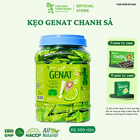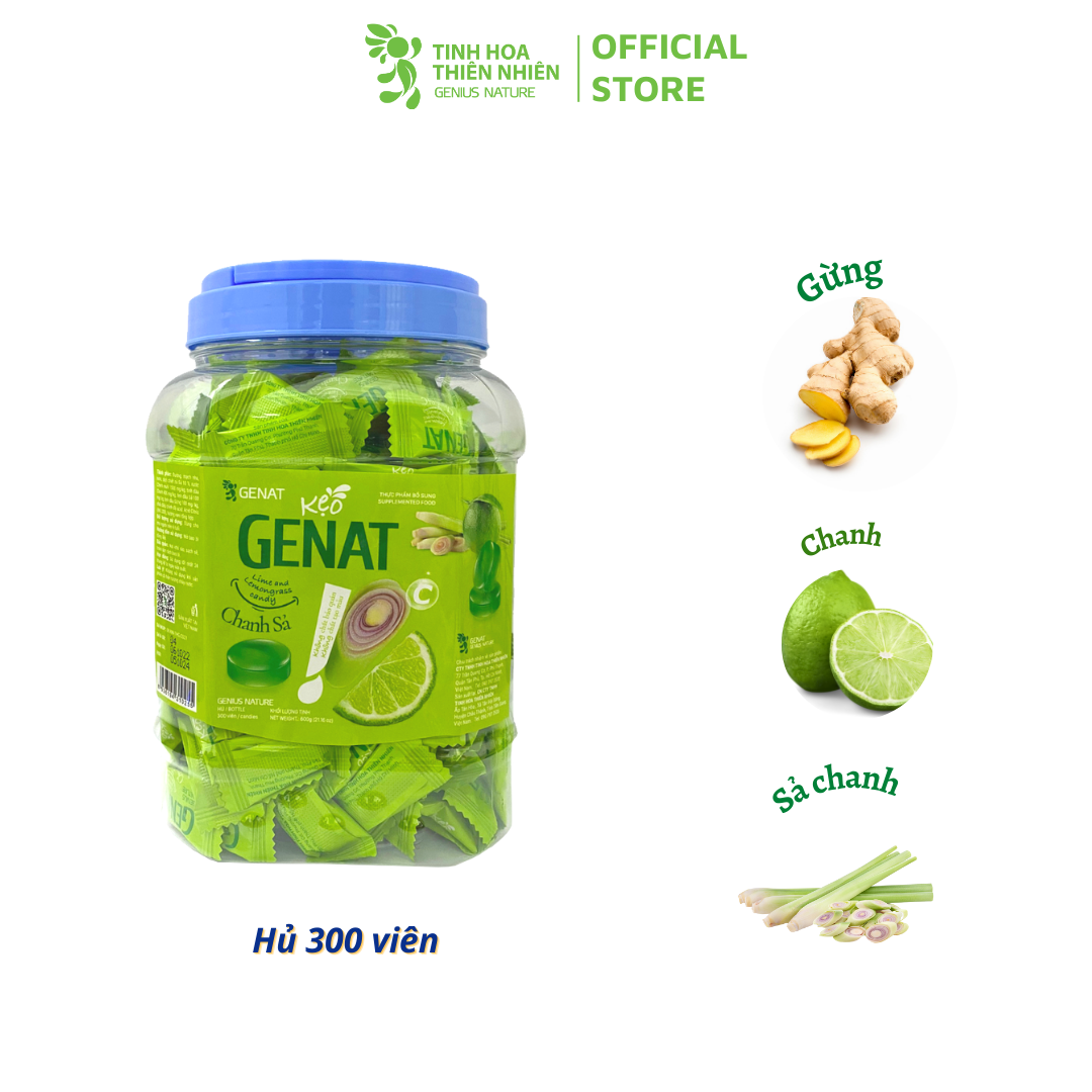Kẹo ngậm Chanh Sả (Hủ 300 viên) - Genat -Tinh Hoa Thiên Nhiên Thành phần: Đường, Mạch nha, nước, dịch chiết củ Sả 10%, nước Chanh muối 1500 mg/kg, tinh dầu Chanh 400 mg/kg, tinh