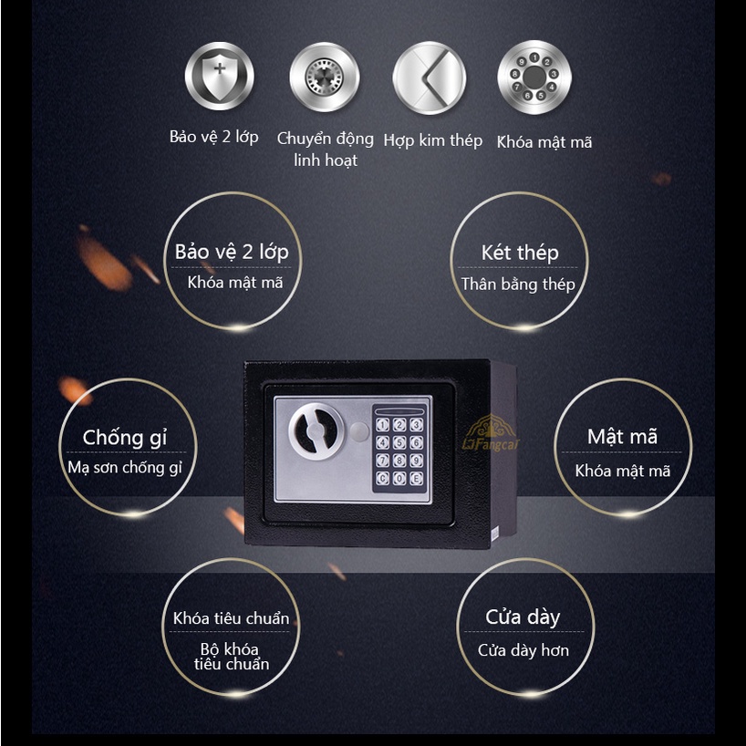 • Két sắt điện tử chống cháy, két sắt mini khoá điện tử được làm bằng hợp kim sơn tĩnh điện, mắc sắc đẹp bắt mắt, bền đẹp phù hợp với không gian hiện đại, có thể giúp các bạn tiết kiệm được các khoản chi tiêu nhỏ nhỏ xinh xinh.