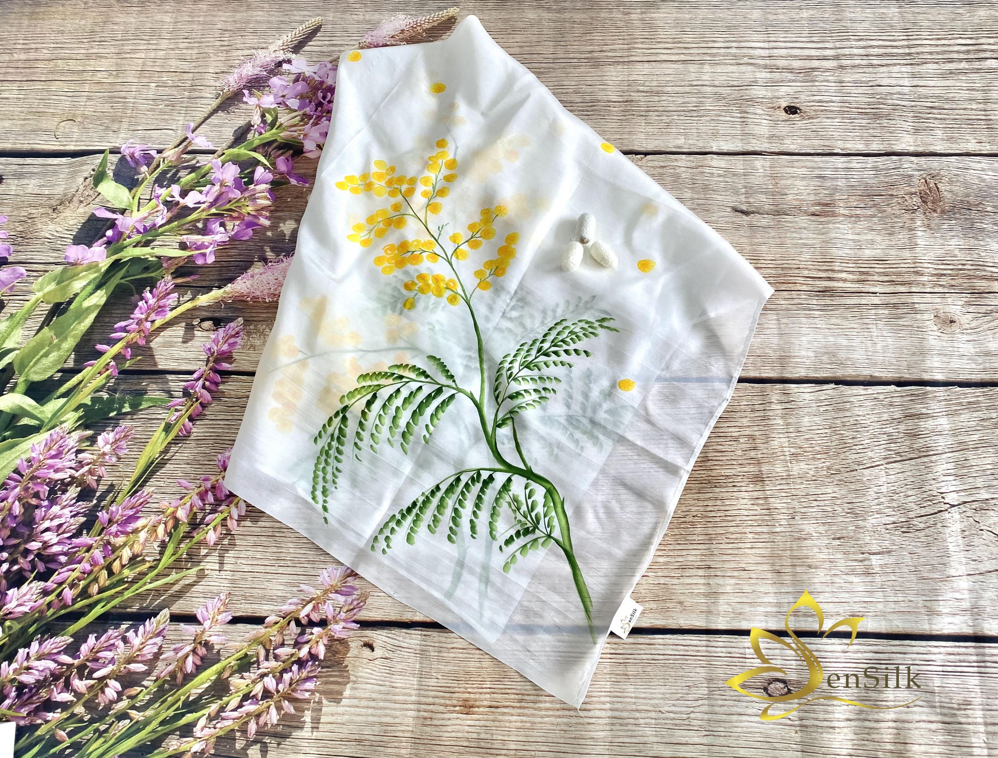 Khăn Lụa Handmade Vẽ Hoa Mimosa SenSilk – tượng trưng cho những tình cảm chân thành, thầm kín và sự cảm thông sâu sắc… Hoa Mimosa được yêu thích không chỉ bởi dáng cây đẹp, cành lá lấp lánh ánh bạc, chùm hoa vàng rực rỡ kiêu sa đầy quyến rũ mà chúng còn được yêu thích bởi chính ý nghĩa của chúng.