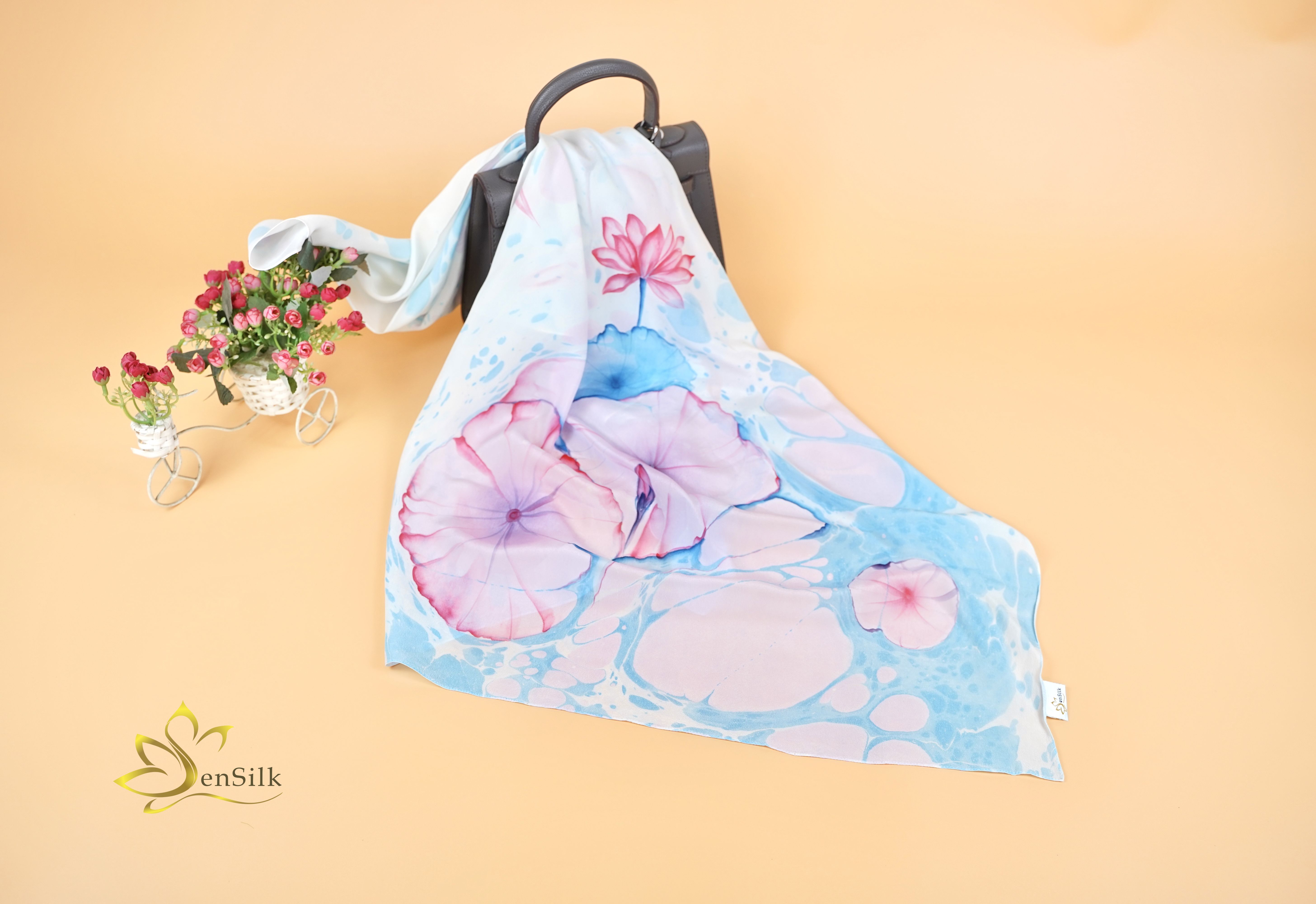 Khăn Lụa Tơ Tằm Thủy Ấn Vẽ Tay Hoa Sen Xanh – SenSilk, Quà Tặng Nguyên Thủ