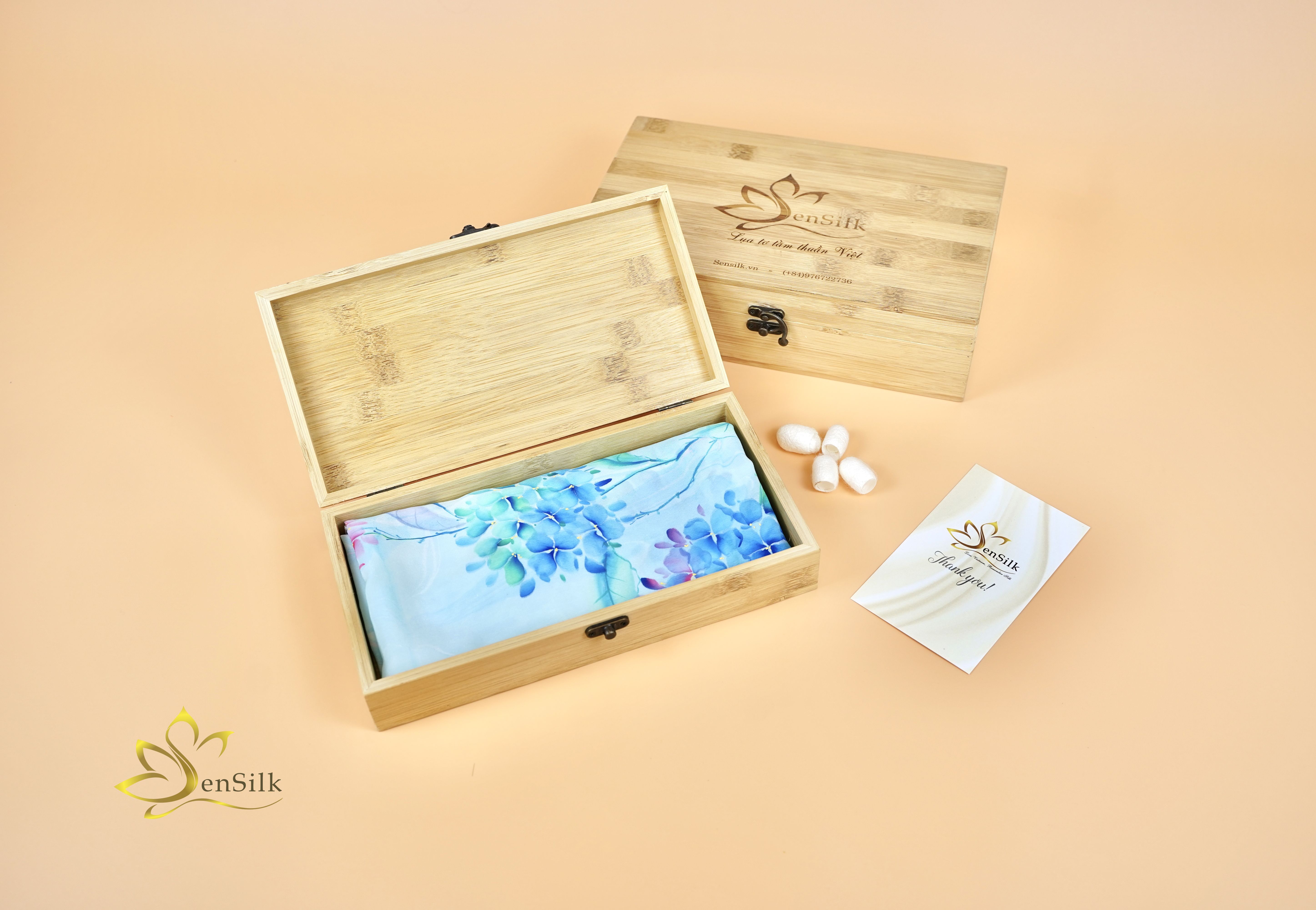 Bộ sản phẩm cao cấp đi kèm: Hộp tre khắc Laser, Túi giấy craft và Thiệp SenSilk.