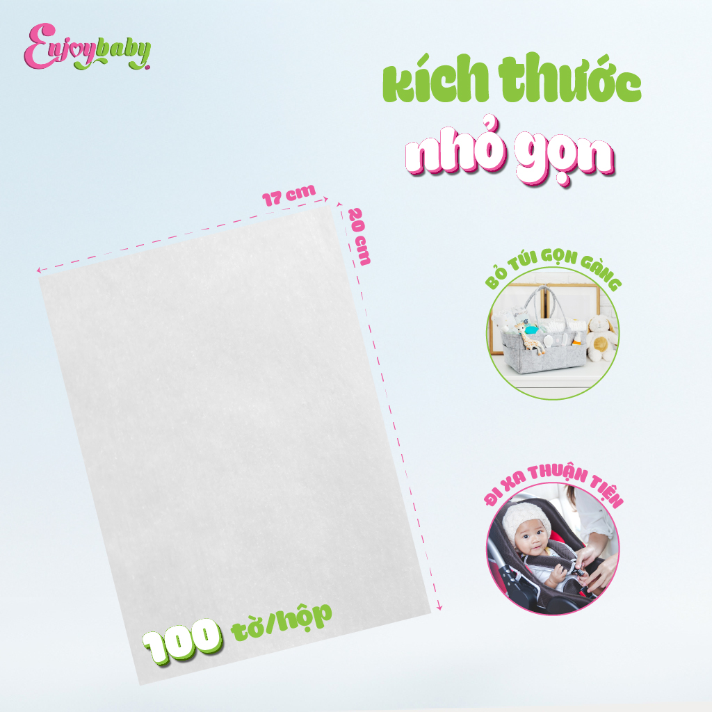 Khăn khô Enjoy được sản xuất từ 100% vải không dệt cao cấp, mềm mại và lành tính kể cả với làn da non nớt của bé.