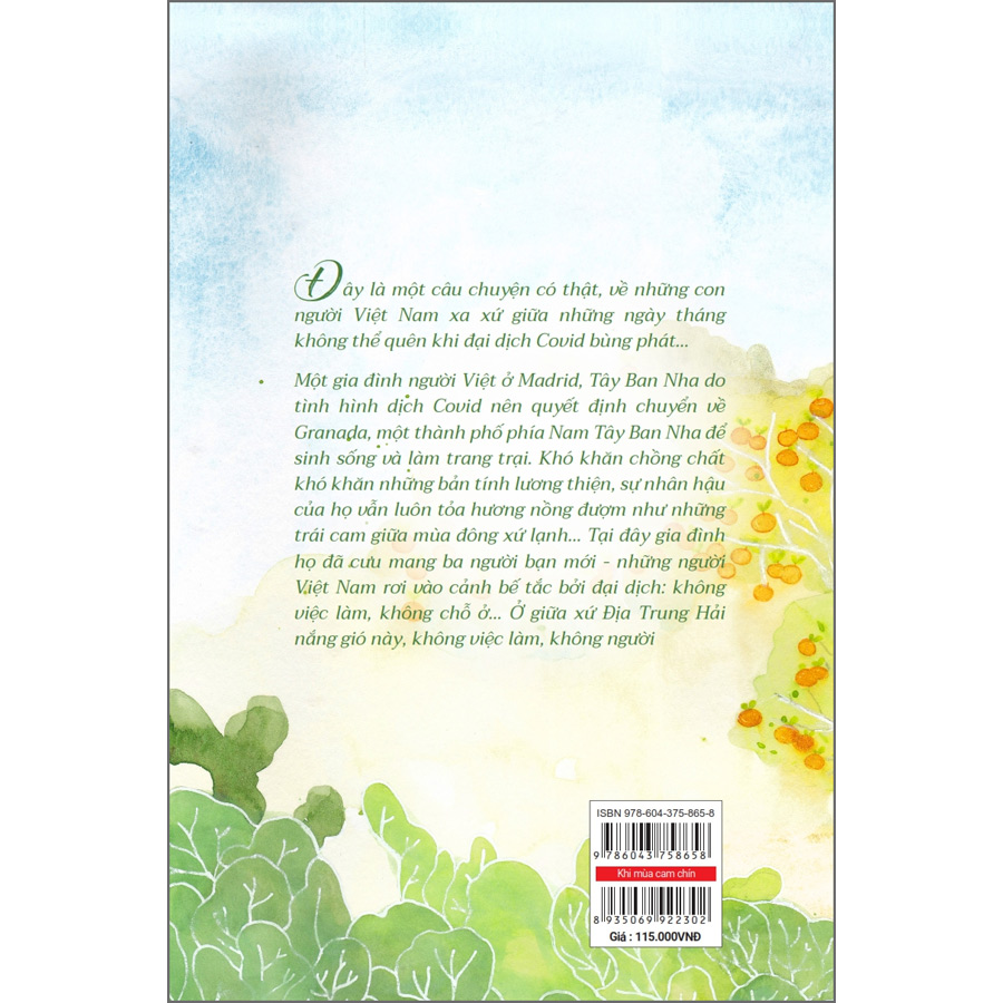 Đây là một câu chuyện có thật, về những con người Việt Nam xa xứ giữa những ngày tháng không thể quên khi đại dịch Covid bùng phát… Một gia đình người Việt ở Madrid, Tây Ban Nha do tình hình dịch Covid nên quyết định chuyển về Granada, một thành phố phía Nam Tây Ban Nha để sinh sống và làm trang trại. Khó khăn chồng chất khó khăn những bản tính lương thiện, sự nhân hậu của họ vẫn luôn tỏa hương nồng đượm như những trái cam giữa mùa đông xứ lạnh… Tại đây gia đình họ đã cưu mang ba người bạn mới - những người Việt Nam rơi vào cảnh bế tắc bởi đại dịch: không việc làm, không chỗ ở… Ở giữa xứ Địa Trung Hải nắng gió này, không việc làm, không người thân. không dư dả tiền bạc,… lại muốn giúp đỡ cả những người khác, họ chỉ có thể dựa vào hai bàn tay và trái tim không ngừng yêu thương,… Rồi cuộc sống của họ sẽ ra sao, những người bạn mới của họ sẽ thế nào? Hãy đọc Khi mùa cam chín để có thêm niềm tin vào tình người giữa cuộc đời đầy những gian nan, và cũng để không ngừng hy vọng vào một tương lai tươi sáng, khi mùa cam chín, tất cả chúng ta đều sẽ ổn và bình yên trở lại…