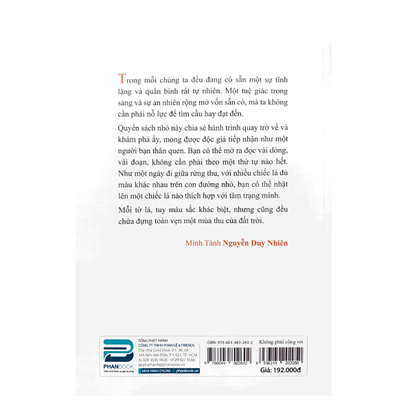 Mua tại TiktokThông tin chi tiết Mã hàng 8936144202050 Tên Nhà Cung Cấp Phanbook Tác giả Minh Tánh Nguyễn Duy Nhiên NXB Lao Động Năm XB 2023 Trọng lượng (gr) 280 Kích Thước Bao Bì 20.5 x 14 x 1.3 cm Số trang 260 Hình thức Bìa Mềm Mô tả sản phẩm Không Phủi Cũng Rơi Trong mỗi chúng ta ai đều đang có sẵn một sự tĩnh lặng và quân bình rất tự nhiên. Một tuệ giác trong sáng và sự an nhiên rộng mở vốn sẵn có, mà ta không cần phải nỗ lực để tìm cầu hay đạt đến. Quyển sách nhỏ này chia sẻ hành trình quay về và khám phá ấy, mong được độc giả tiếp nhận như một người bạn thân quen. Bạn có thể mở ra đọc vài dòng, vài đoạn, không cần phải theo trình tự nào hết. Như một ngày đi giữa rừng thu, với nhiều chiếc lá đủ màu khác nhau trên con đường nhỏ, bạn có thể nhặt lên một chiếc lá nào thích hợp với tâm trạng mình. Mỗi tờ lá, tuy màu sắc khác biệt, nhưng cũng đều chứa đựng toàn vẹn một mùa thu đất trời. Minh tánh Nguyễn Duy Nhiên