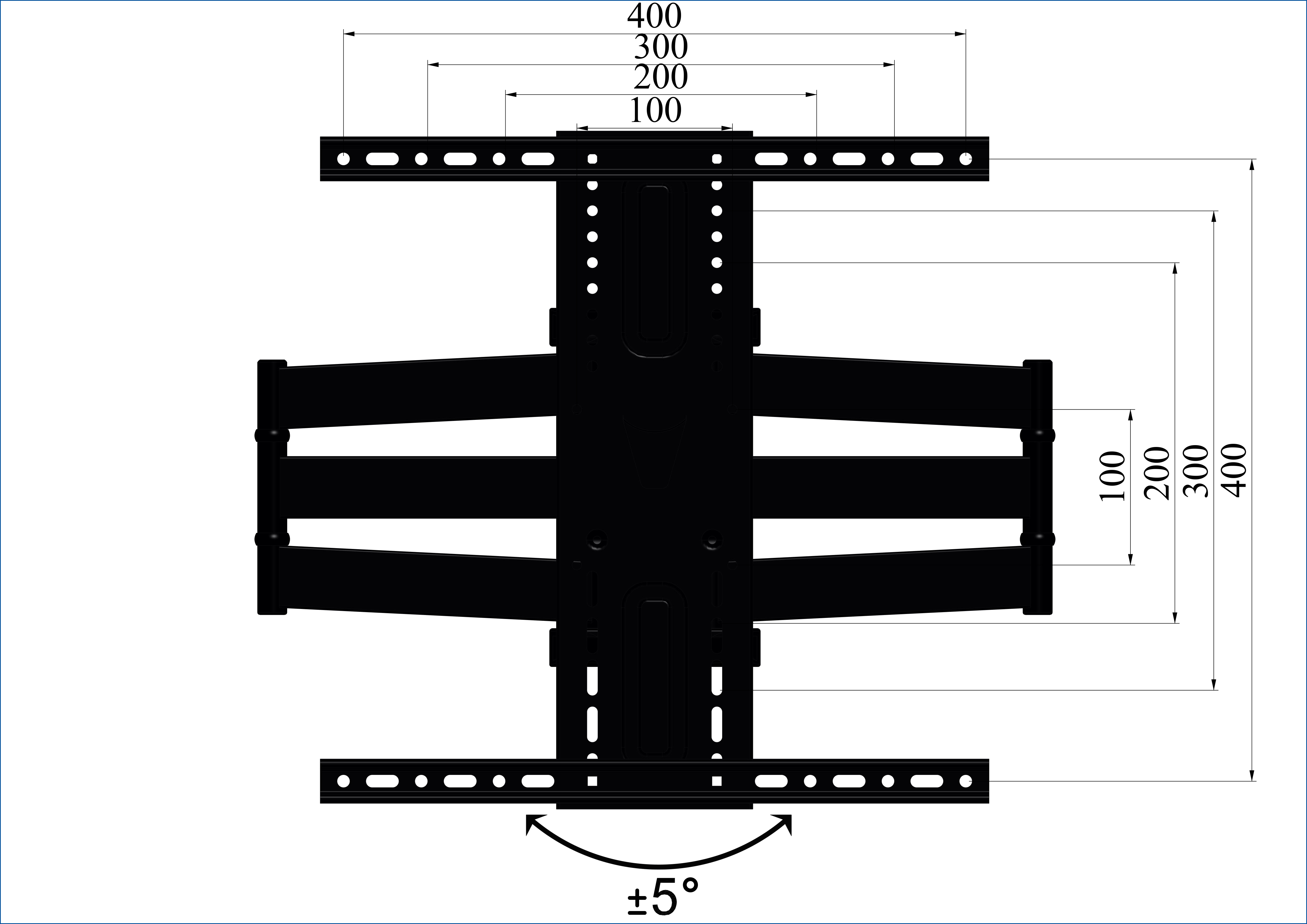Thông số kĩ thuật - Vesa: 400x400 mm - Xoay 180 độ tại các khớp nối - Thiết kế kẹp nhựa đế nẹp dây điện - Khoảng cách kéo dãn tối đa: 468mm - Thu