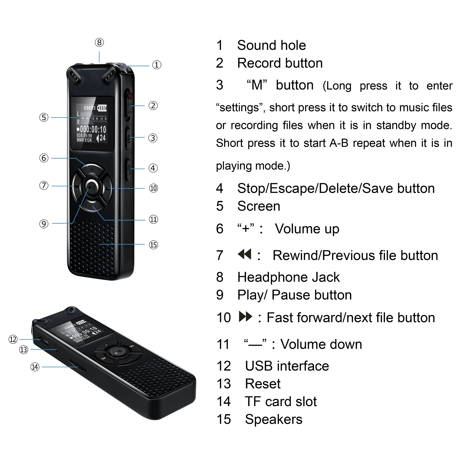 Chất liệu vỏ: Hợp kim kẽm Màn hình: Màn hình màu TFT 1,44 inch Định dạng ghi âm và tốc độ lấy mẫu: Định dạng WAV (32Kbps-1536Kbps) Chất lượng ghi âm: WAV 512Kbps (mặc định)
