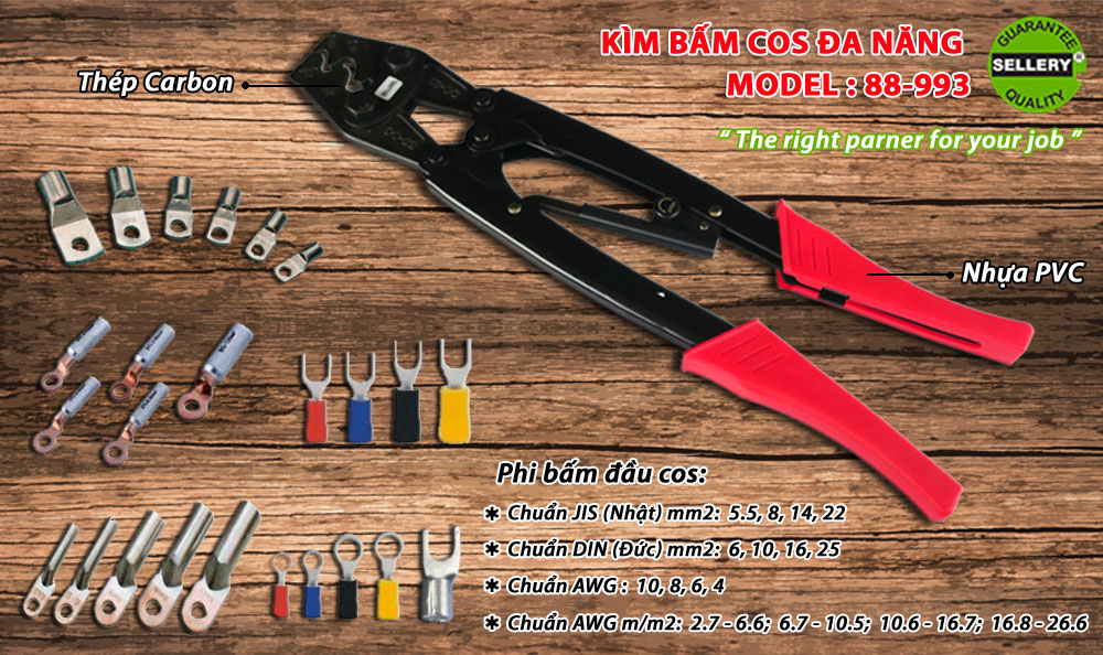 • Kìm bấm cos Sellery 88-993 có lưỡi cứng, được sản xuất trên dây chuyền hiện đại tạo nên độ sắc bén cao nhưng không làm ảnh hưởng đến lõi dây.