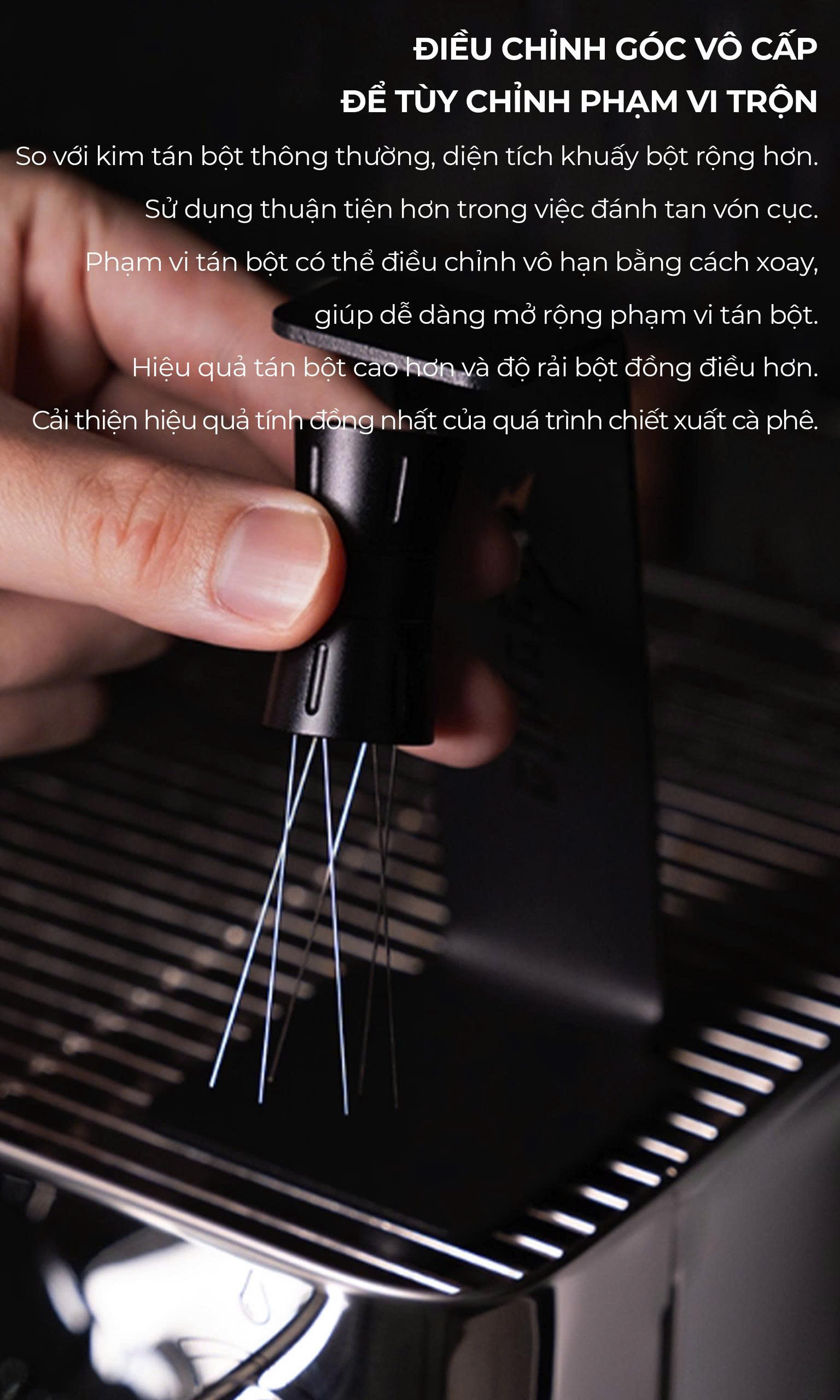 KIM TÁN ĐỀU BỘT CÀ PHÊ ESPRESSO ️Tránh tình trạng vón cục cà phê bên trong basket. ️Chất liệu: Inox 304.  Bên cạnh tầm quan trọng không thể thiếu của Tamper và Tamper OCD trong pha espresso. Dụng cụ đánh tơi bột cà phê cũng làm item bạn nên bổ sung cho bộ dụng cụ pha chế của mình để đạt được ly Espresso ngon hơn và chuẩn hơn. Với dụng cụ đánh tơi, bột cà phê trong rổ lọc được đều hơn, tránh tình trạng vón cục bên trong bánh cà phê, chiết xuất espresso sẽ không được đều, ảnh hưởng rất nhiều đến chất lượng, mùi vị của ly espresso.  Sản phẩm được thiết kế dạng núm vặn bằng hợp kim nhôm sơn nhám. Cảm giác cầm rất chắc chắn và vừa tay. 8 thanh kim loại mỏng có độ dẻo và có thể uốn cong len lõi đánh tơi đến mọi nơi bên trong bánh cà phê. Khi bột được đánh tơi sẽ giúp phần tamping tốt hơn rất nhiều, áp suất nước sẽ chiết xuất đều hơn.