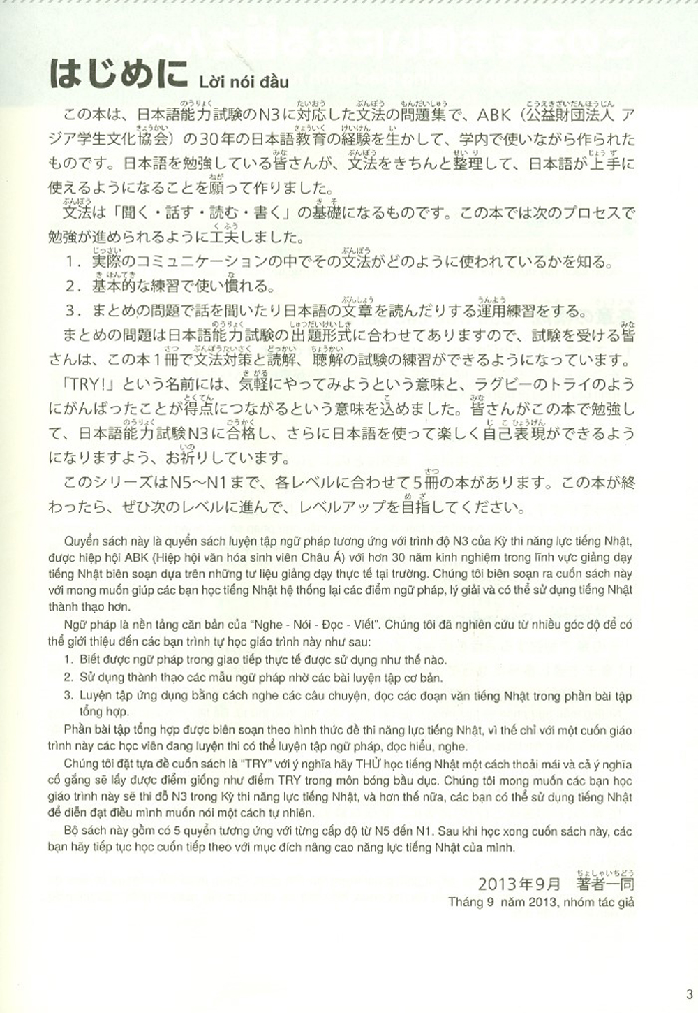 Mua tại TiktokBộ giáo trình TRY! gồm một cuốn TRY! Start cho các bạn mới bắt đầu học tiếng Nhật và 5 cuốn TRY! N1, N2, N3, N4, N5 giúp phát triển các kỹ năng tiếng Nhật thông qua việc học ngữ pháp. Bộ giáo trình này là tài liệu luyện thi thiết thực cho "Kỳ thi năng lực Nhật ngữ" các cấp độ từ N5 đến N1, giúp người học nắm chắc các điểm ngữ pháp và vận dụng chúng thông qua các bài luyện tập Nghe - Đọc.