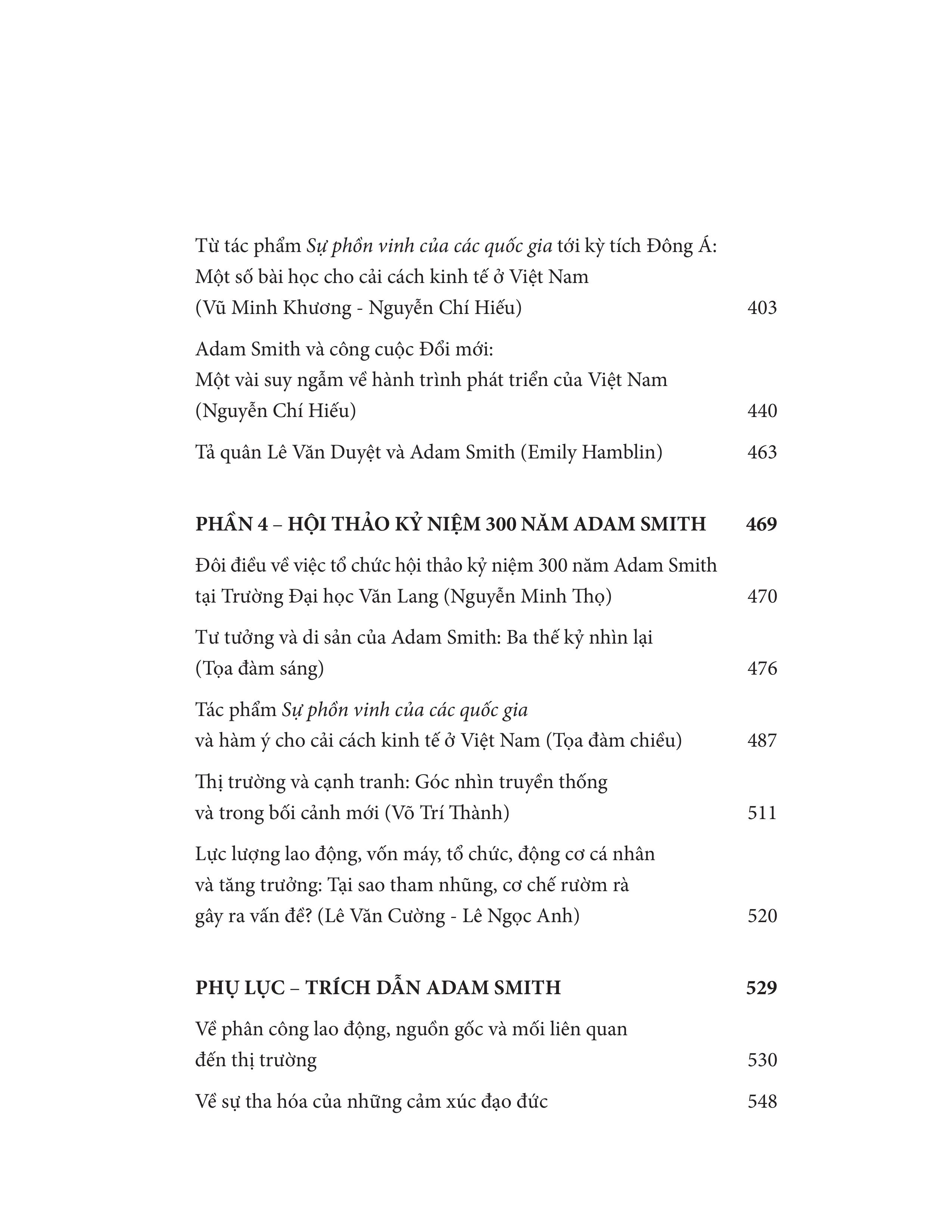 Cùng với đó là phần Phụ lục trích dịch 2 tác phẩm quan trọng nhất của ông - Sự phồn vinh của các quốc gia và Lý thuyết về tình cảm đạo đức. Trong gần 600 trang sách, các tác giả đã phác họa lại cuộc đời, bối cảnh lịch sử thời Adam Smith sinh sống, những yếu tố góp phần hun đúc nên tư tưởng quan trọng của ông; bên cạnh đó, các tác giả đã phóng chiếu, bàn sâu về sự ảnh hưởng của ông lên lý thuyết kinh tế thế giới, cho thấy tư tưởng vượt thời cùng những cấp tiến bên trong bộ óc lỗi lạc.