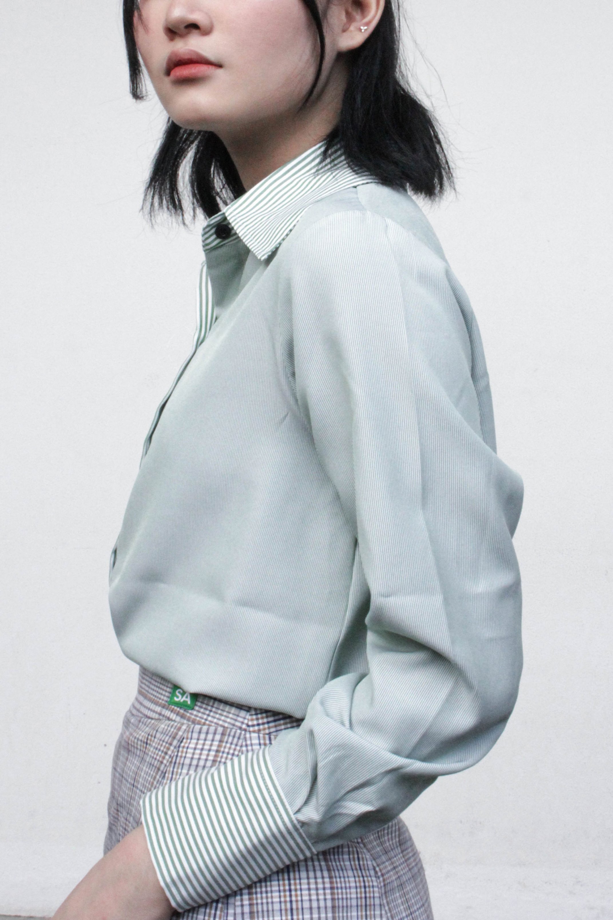 CHẤT SOMI COTTON PHA, MỀM ĐỨNG PHOM ÁO MÀU XANH LÁ ÁO CỔ SOMI, TAY DÀI, NÚT ĐEN PHOM CĂN BẢN SUÔN ĐIỂM NHẤN PHẦN LÁ CỔ, NẸP ÁO, MANGSET BẰNG VẢI HOẠ TIẾT KHÁC