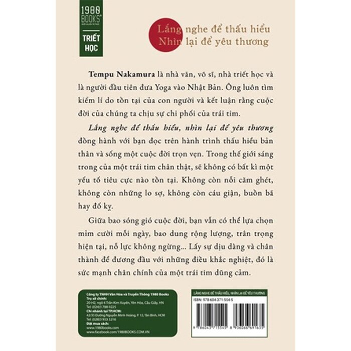 Tác giả Tempu Nakamura luôn tìm kiếm lí do tồn tại của con người từ “trạng thái của trái tim” và ông kết luận rằng cuộc đời của chúng ta chịu “sự chi phối của trái tim”. Từ quan điểm đó, cuốn sách “Lắng nghe để thấu hiểu, nhìn lại để yêu thương” này nhấn mạnh tới câu nói của nhà văn Tempu và được biên soạn một cách dễ hiểu, hơn nữa còn sử dụng những từ ngữ làm lay động trái tim, hướng tới những người luôn nung nấu ý nghĩa về cuộc sống. Hãy luôn sống vui tươi ngay cả khi bạn chỉ có một mình. Khi quen với điều này, vầng hào quang sẽ bao quanh bạn, sẽ có nhiều người bị hấp dẫn bởi điều đó và bạn sẽ có thêm thật nhiều bạn bè. Nhà văn Tempu cho rằng việc sống một cách tự nhiên chính là như vậy.