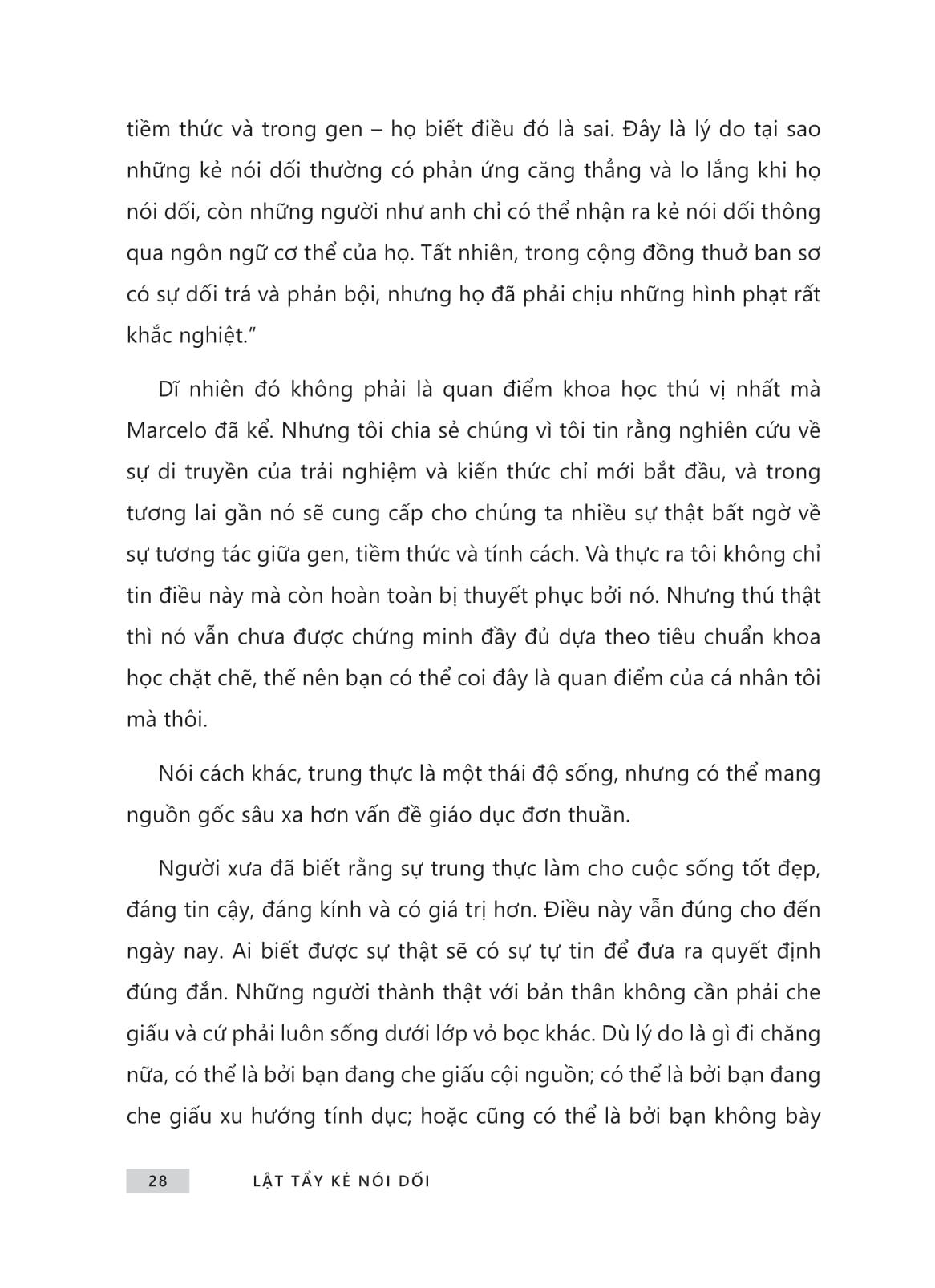 Dù bảo vệ sự thật không dễ dàng chút nào vì nói dối thuận tiện, dễ làm mẫu và mang lại lợi ích tức thời cho người nói, thì bạn vẫn nên hiểu rằng sự dối trá sẽ không giúp bạn đi xa. Cứ lạm dụng những lời nói dối vì ít để lại hậu quả thì về sau, dù bạn có nói thật cũng chẳng mấy ai tin. Đó là lý do chúng ta nên lựa chọn đứng về phía sự thật, LẬT TẨY KẺ NÓI DỐI, nhìn-thấu-điều-kẻ-khác-đang-che-giấu để biến môi trường xung quanh thành một nơi an toàn mà chúng ta được là chính m.ình.