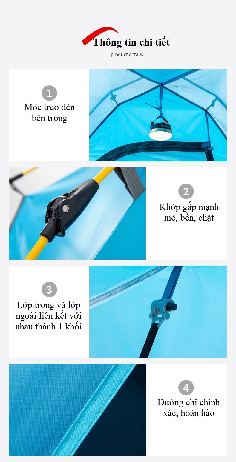 – Kích thước lều lớn, không gian rộng rãi thoải mái cho 3-4 người sử dụng.