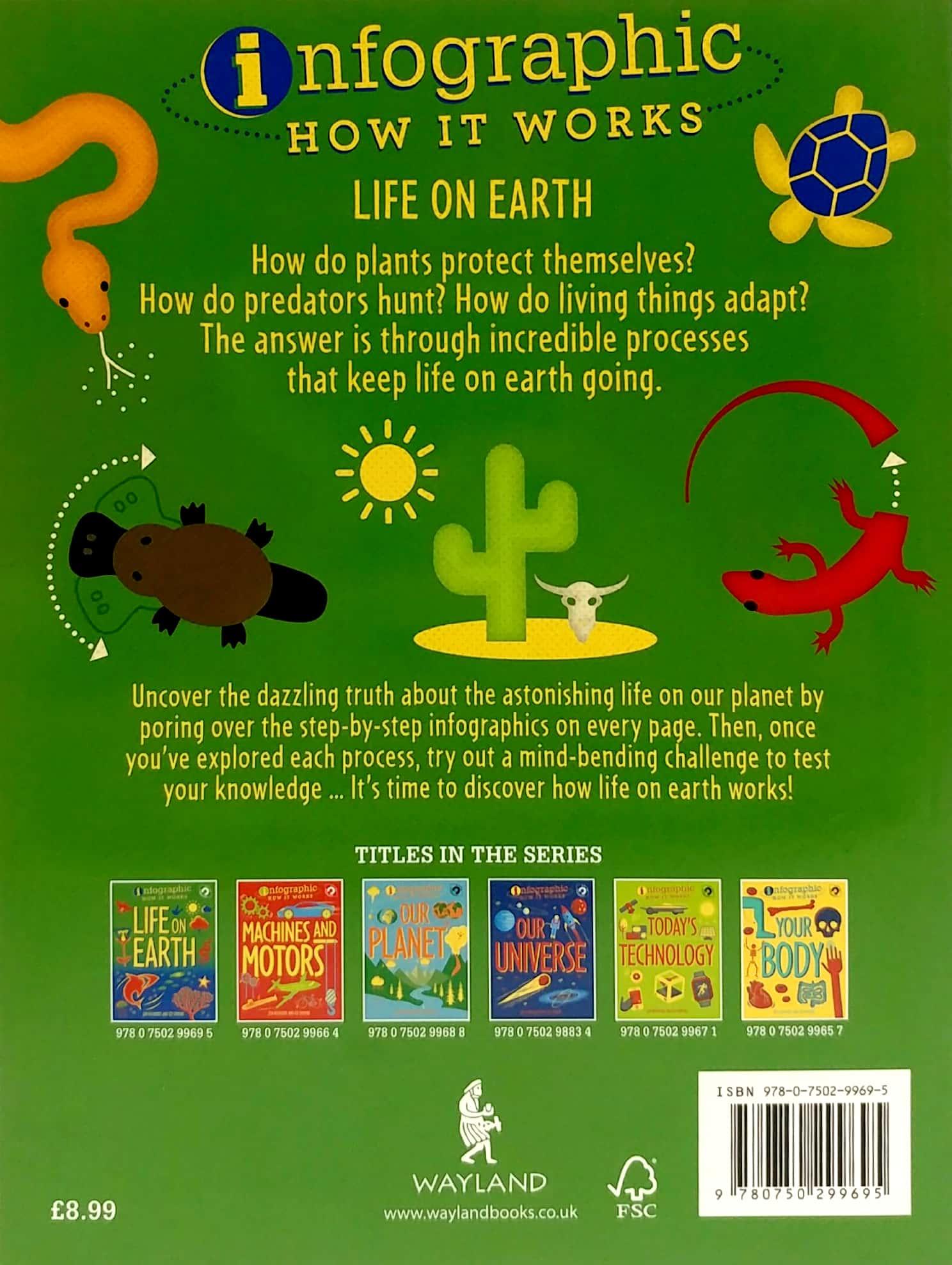 In order to survive, all living things on Earth must adapt to their environment. They all have certain senses that help them hunt for prey or ways they protect themselves. It's impossible to learn all of it, but through the infographics in this book, readers are sure to understand a great deal. With colorful diagrams and succinct text, each chapter covers a different facet of life on Earth, including how plants protect themselves, cold adaptations, and the carbon cycle. "Try This" boxes throughout the book engage readers by suggesting activities and asking questions related to the text.
