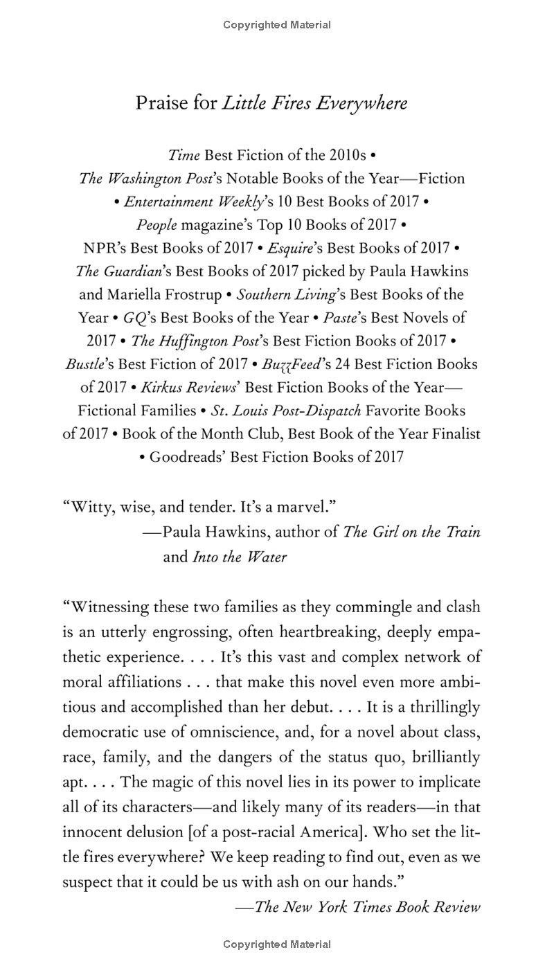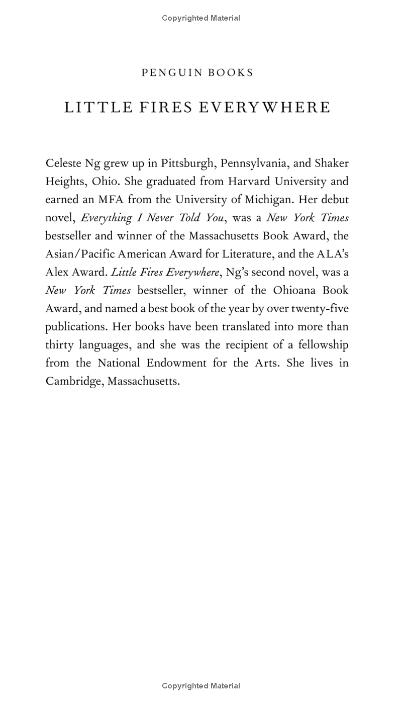 Enter Mia Warren—an enigmatic artist and single mother—who arrives in this idyllic bubble with her teenaged daughter Pearl, and rents a house from the Richardsons. Soon Mia and Pearl become more than tenants: all four Richardson children are drawn to the mother-daughter pair. But Mia carries with her a mysterious past and a disregard for the status quo that threatens to upend this carefully ordered community.